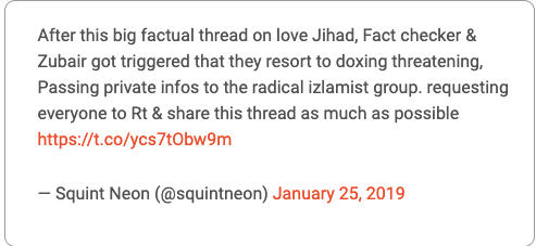 Earlier in 2020, founder Pratik Sinha doxxed unsuspecting twitter handles simply because he did not agree with their political views. This resulted in the twitter handle receiving a barrage of threats and abuse by radical Islamists on twitter. The twitter handle had made a thread on love jihad which did not go down well with the founders of Alt News, Pratik Sinha and Moahmmed Zubair. Doxxing means to search and publish private or identifying information on the individual over the internet