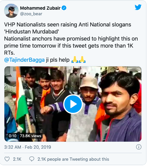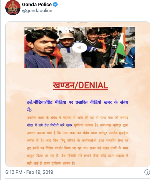 On another occasion Alt News co-founder Mohammed Zubair shared a cropped video via his twitter handle alleging Vishwa Hindu Parishad of Gonda, Uttar Pradesh during a protest rally against Pakistan condemning Pulwama terror attacks. He also urged his followers to ‘retweet’ to spread propaganda against Hindus and incite communal disharmony. Gonda Police immediatley issued a statement rejecting the claims of Alt News.