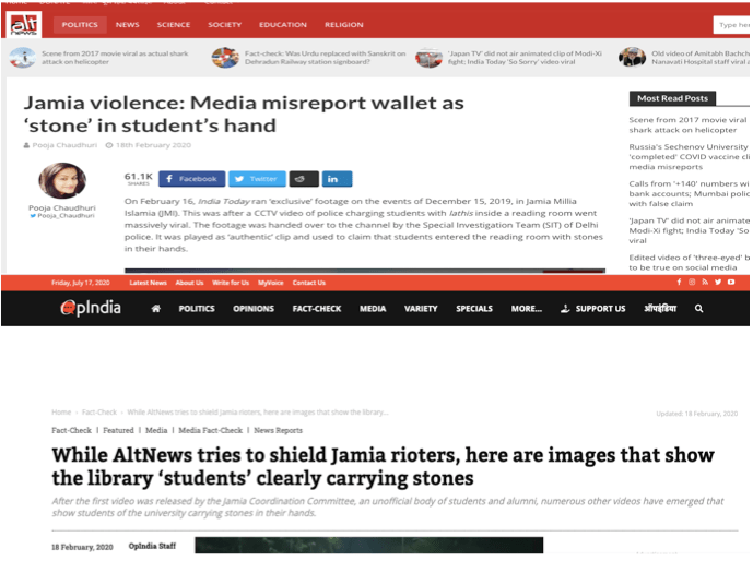 During anti Citizenship Amendment Act (CAA) protest, ALt News shielded students from Jamia Milia Islamia university who were rioting and throwing stones at Delhi Police. The stones were termed as ‘wallets‘ after their alleged ‘fact check’. Take a look at the image below. Notice the difference how Alt News reported and the actual news.