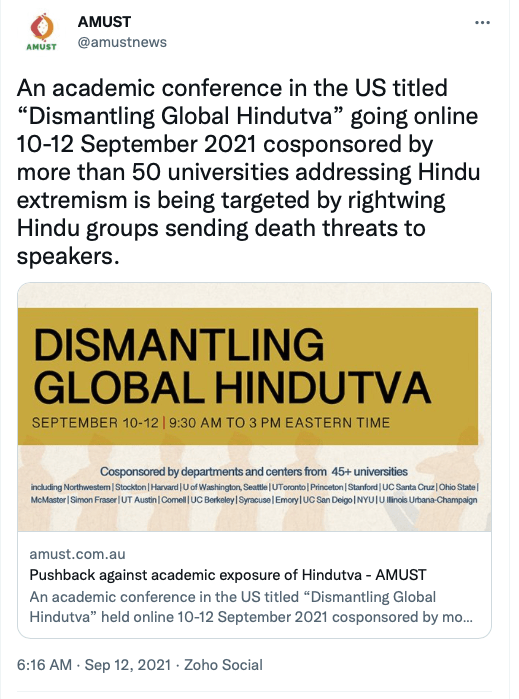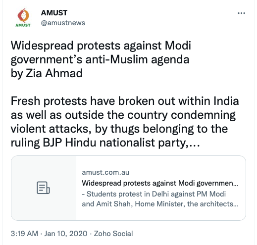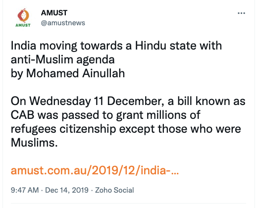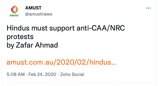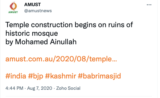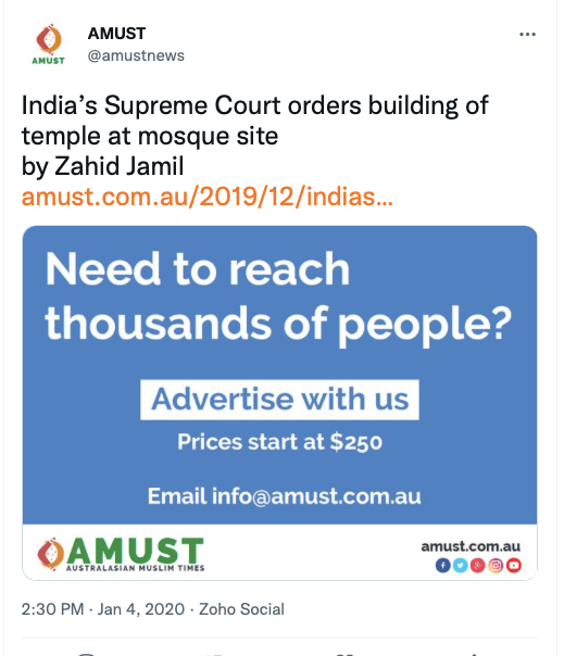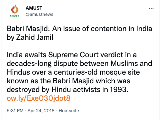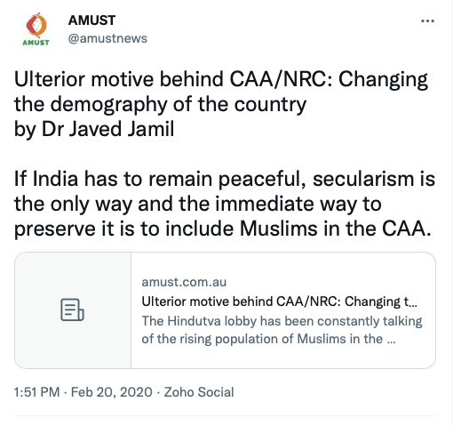 Given their stance on Kashmir, Khalistan and Hindus, it should come as no surprise that AMUST also supported anti-CAA protests, called Ram Janmabhoomi verdict ” a revenge for a thousand years of Muslim rule in India“, seen with anti-India forces such as IAMC, Hindus for Human Rights, CAIR, ISNA, ICNA, The Humanism Project, and the likes. Below are some of their social media posts.