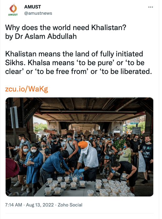 Dr.Aslam Abdullah aslo justifies the necessity for Khalistan in “Why does the world need Khalistan?“. In this he blames Hindus for being hateful and violent and says “As a Muslim, I feel compelled to support Khalistan because my religious scripture reminds me to stand for good wherever I find it.” equating the presence of Jewish state to justify Khalistan and says “Under a Hindu nationalist government, India would have to face a vibrant Sikh movement with support from Europe, North America, and Australia for a separate homeland for Khalsas.”