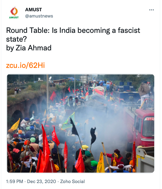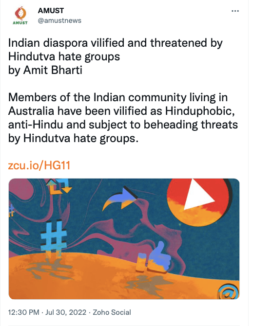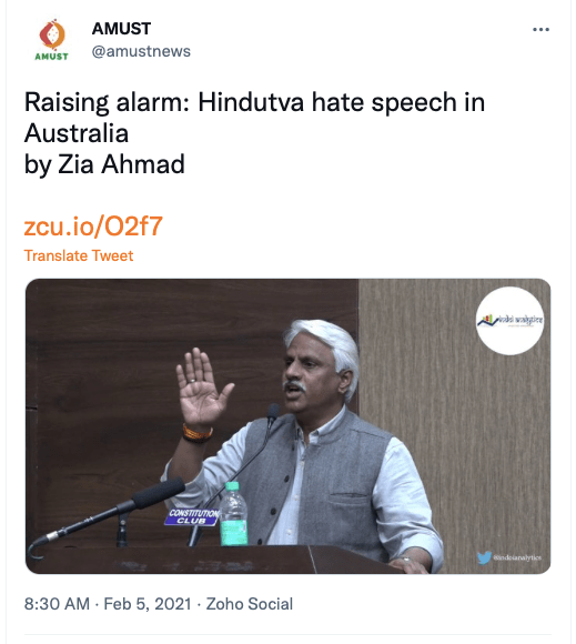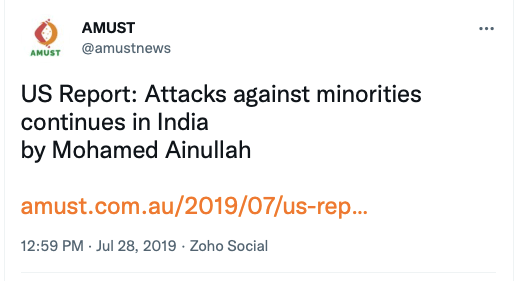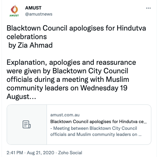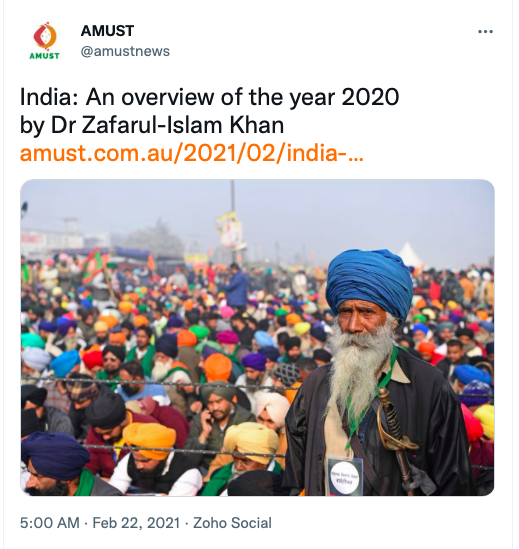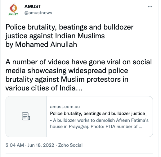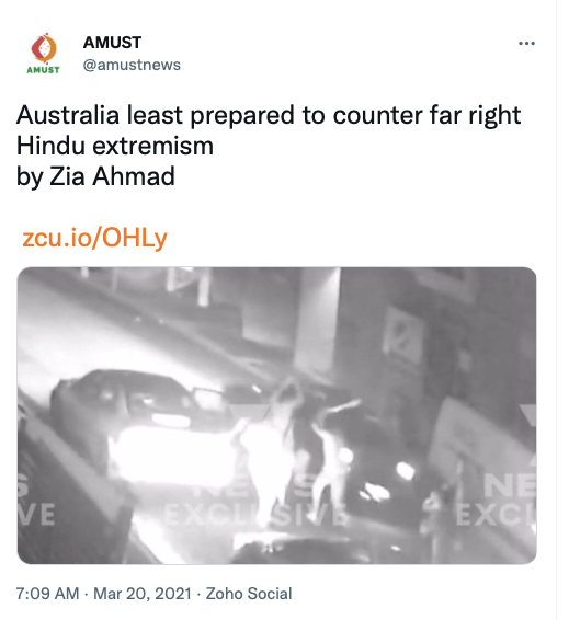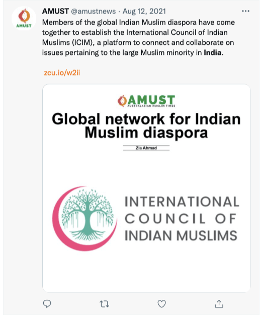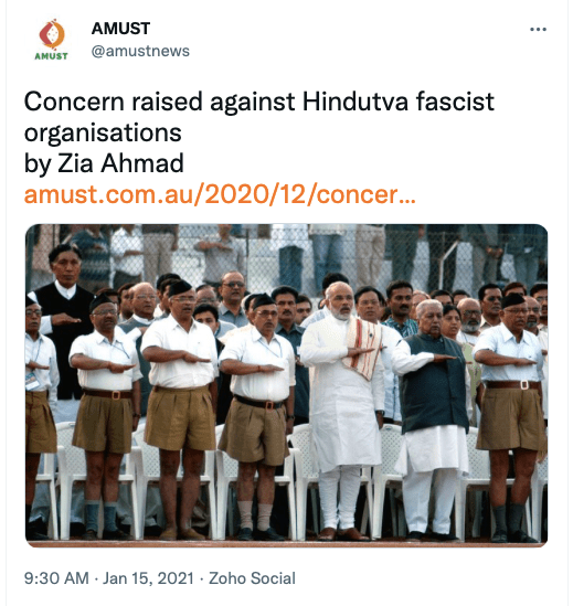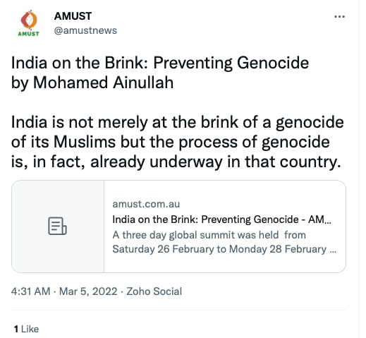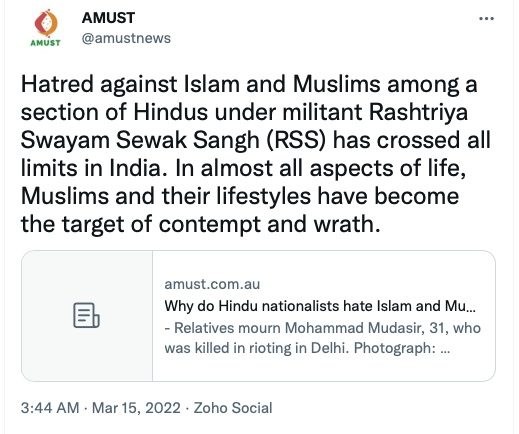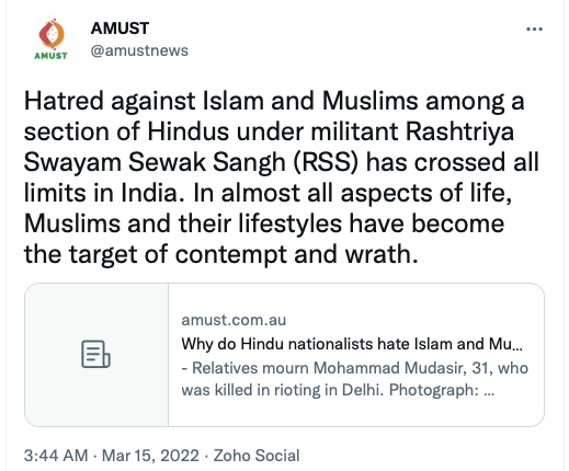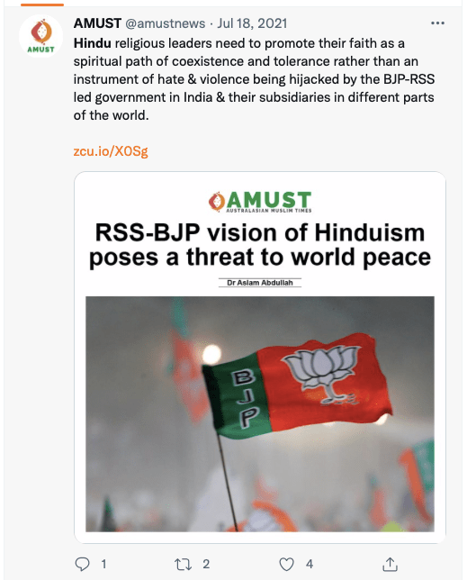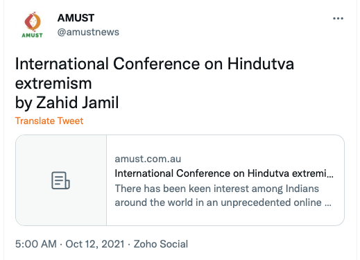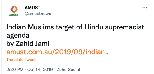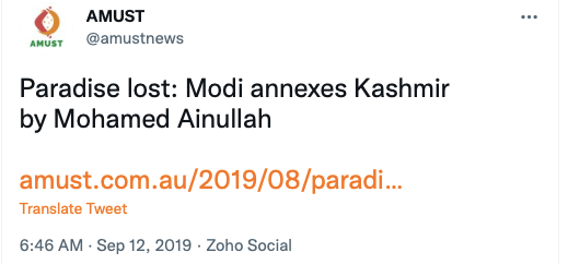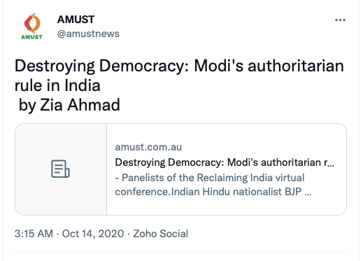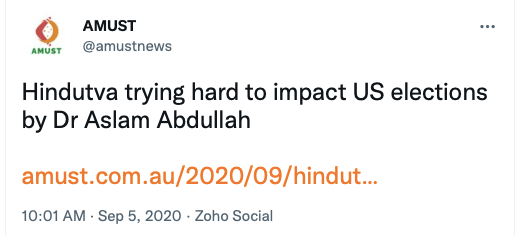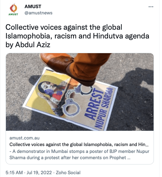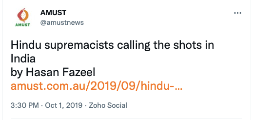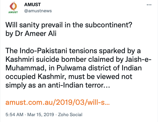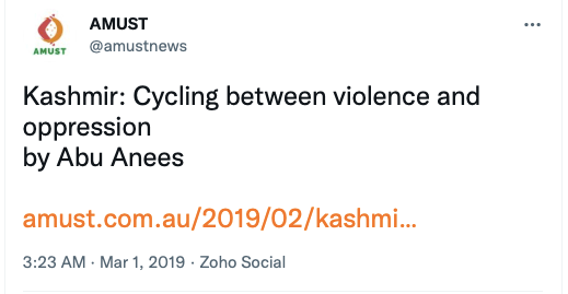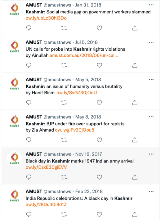 AMUST’s pro-Pakistan is evident in its articles parroting Pakistani regime’s rhetoric on India. For example, in 2018 Zia Ahmad denounced “Indian belligerence against Pakistani peace overtures” in the wake of Imran Khan’s purported efforts to “[offer] an olive branch to India in order to solve disputes between the two neighbours through dialogue.” In 2020 editorial “Modi’s hawkish move in Kashmir destabilising the whole region“, author accuses ruling BJP of using Pulwama terror attack to create “hysteria against Pakistan and playing Hindu/Muslim divisive politics for its electoral advantage, thus helping Modi to win a second term during federal elections mid 2019.”