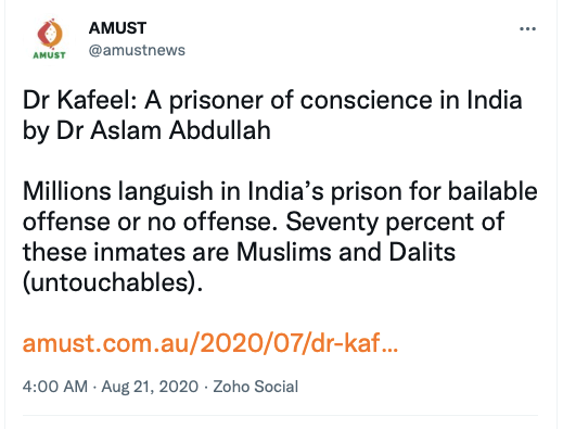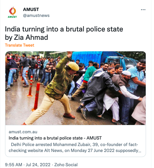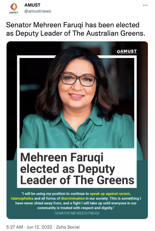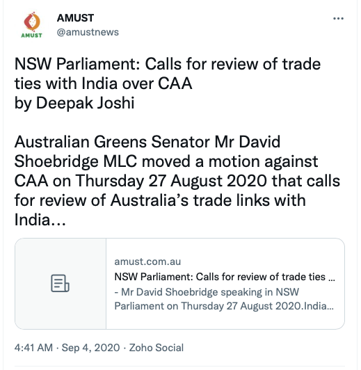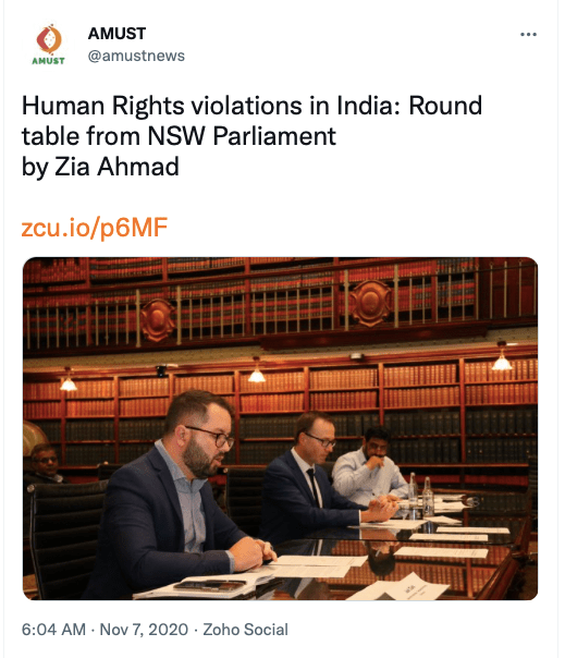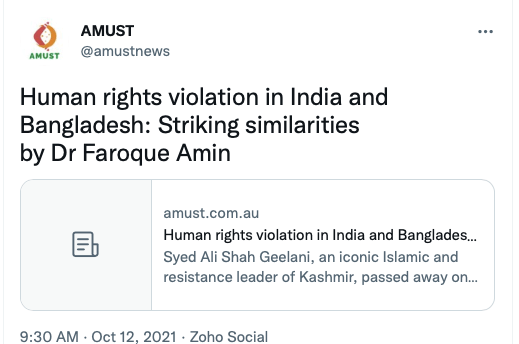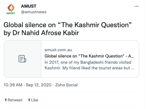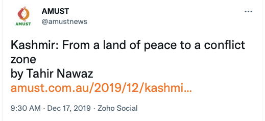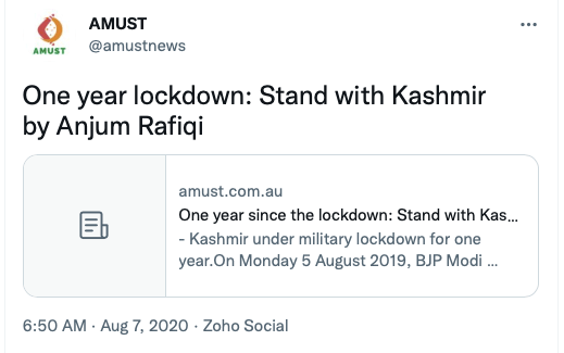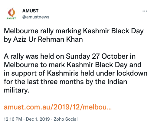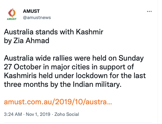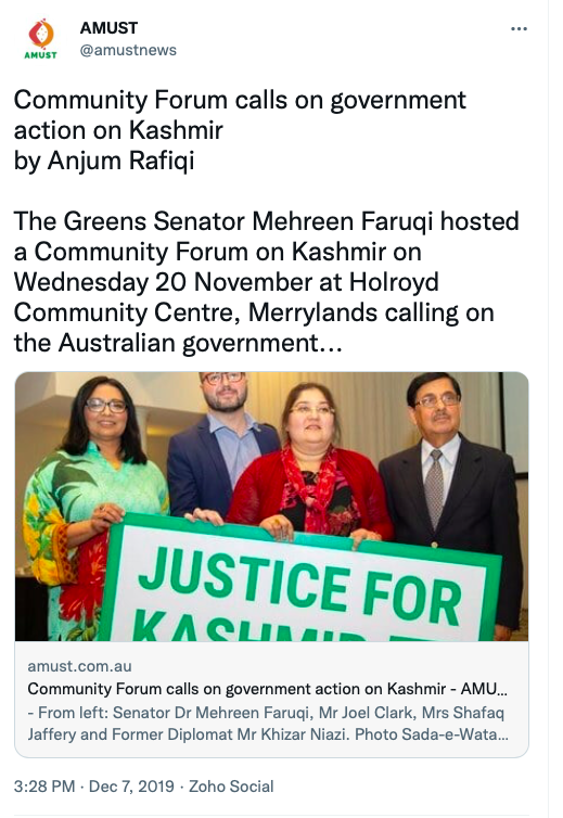 Stand With Kashmir’s Australia representative Anjum Rafiqi has his own column at AMUST where he routinely posts articles showing support from Australia’s political parties, especially the Greens Party.
