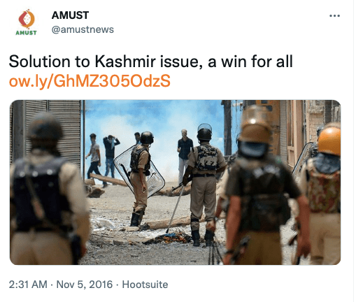 In their articles on Kashmir, India has been called “forcible occupier“, “settler-colonial“, “India annexed Kashmir” and “Indian occupied Kashmir“. They have been against Indian government’s move to remove special status given to Kashmir by abrogating Article 370 and 35A. Pushing Pakistan’s stance on Kashmir, AMUST has frequently demanded for a plebiscite on the future of Kashmir.