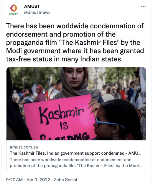 AMUST called The Kashmir Files a “fictional film, propaganda film aligned with Hindutva narratives promoting Islamophobia in order to justify oppression of Kashmiri Muslims and legitimise their impending genocide.” The film is based on account of 700 victims and witnesses.