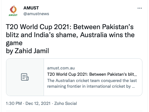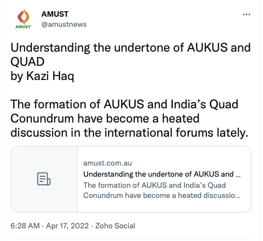 AMUST is an Islamist newspaper and news portal operating from Australia. It is run by Australian-Indian, Zia Ahmad, whose late father Dr.Qazi Ashfaq Ahmad started it in 1991. The paper is sympathetic to Bangladesh’s Jamat-e-Islami that helped Pakistan army conduct a genocide during 1971 Bangladesh Liberation War. Dr. Ashfaq Ahmed is cousin of India’s former Vice-President Hamid Ansari. It is also sympathetic to Pakistan promoting Pakistan’s interest along with being pro-independence for Kashmir and Khalistan.