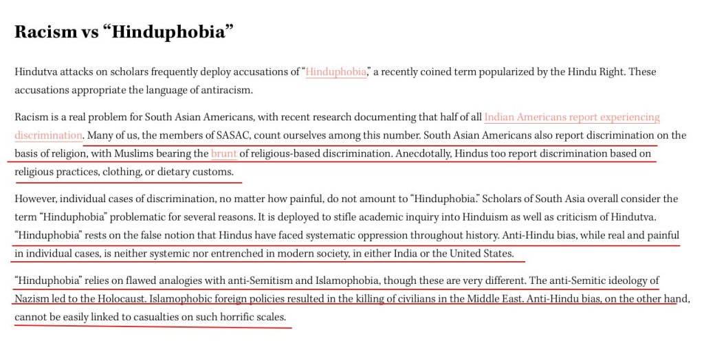 On the same lines as Prof. Dutta who equates Hindutva with white supremacy, AAPI too equates Hindutva with White supremacy. Not only where they a supporter of Dismantling Global Hindutva conference, AAPI aslo promoted and shared Audrey Truschke’s “Hindutva Harassment Field Manual” by South Asia Scholars Activist Collective. The manual explicitly states that “Hinduphobia rests on the false notion that Hindus have faced systematic oppression throughout history……Hinduphobia relies on the flawed analogies with anti-Semitism and Islamophobia….Anti-Hindu bias, on the other hand, cannot be easily linked to casualties on such horrific scales.” In short, AAPI accept that there is no Hinduphobia and that Hindus have not faced horrific, historic genocides that the hands of Islamic invaders or Christian crusaders.