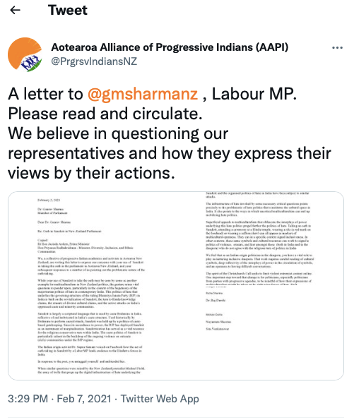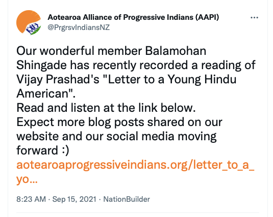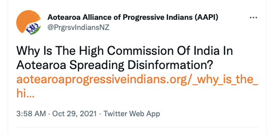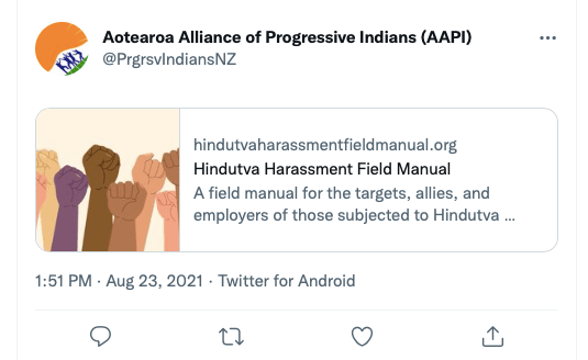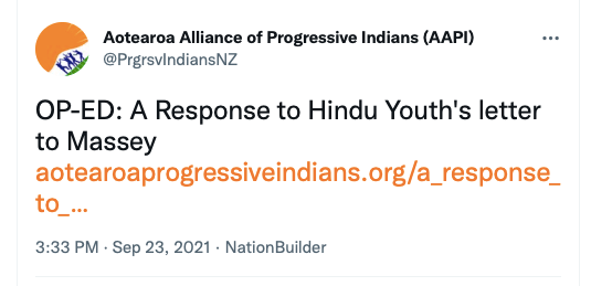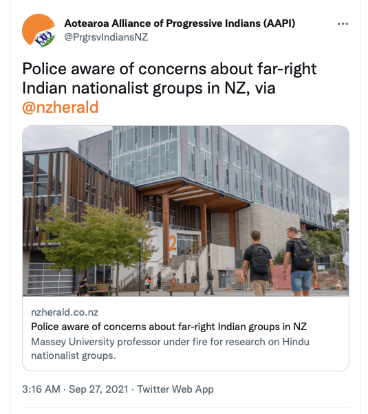 During the uproar on Prof Dutta’s Hinduphobic white paper for Massey University, NZ media took bytes from AAPI as representative of Hindus and Indians. AAPI wrote a letter to New Zealand Human Rights Commission in response to Hindu groups who approached NZ HR commission asking Massey University to apologise for maligning Hindus. In the letter AAPI says “We are Hindus New Zealanders and member of Aotearoa Alliance of Progressive Indians”. This is false since AAPI has members who are not Hindus. Further, the letter states ultra radical leftist take “Hindutva is not Hinduism” and that Hindu Council NZ doesn’t represent all Hindus. The letter also mentions that Prof. Dutta is a Hindu which again misleads NZ HR commission as Prof. Dutta is a self-certified communist. Read Dutta’s profile here.
