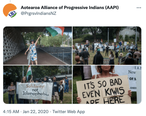 AAPI organised anti-CAA, anti-NRC protests in Auckland, New Zealand on the fake news that CAA will take away citizenship from 200 million Indian Muslims. They get support from Australia’s The Humanism Project, US based Hindus for Human Rights, and media push from portals like NRI Affairs.