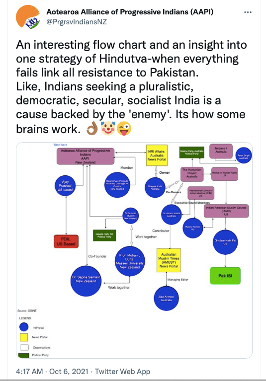 AAPI was created in January 2020 during the peak of anti-CAA protest in India. AAPI identifies itself as “a collective of community members, activists, artists, performers, academics, physicians, and professionals from across Aotearoa New Zealand committed to a vision of India based on progressive values.” Main members of AAPI are Dr. Sapna Samant, Oscar Romero, Balamohan Shingade. Prof. Mohan J Dutta works closely with Samant and AAPI. Another person who works closely with AAPI and Dutta identifies herself as Azad Richa and is a campaign manager for New Zealand’s Greens Party. Dr. Samant also owns a media company called Holycow Media and has often been referred by NZ media as ‘minority media owner‘.