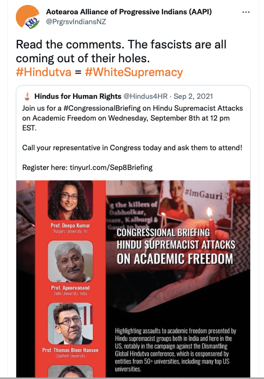 AAPI represents itself as a ‘Hindu group’ even when some of their members have shown utter contempt for Hindus and Hinduism. For example, when NZ elected Indian-origin Member of Parliament Gaurav Sharma took oath in Sanskrit, Samant wrote to him on FB that he was upholding “Hindu upper caste privilege……domain of brahmins” and that Sanskrit has discriminatory connotations attached to it. She calls practising peaceful Hindus ‘Hindu extremists, Hindu fundamentalists’.
