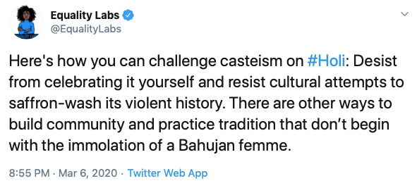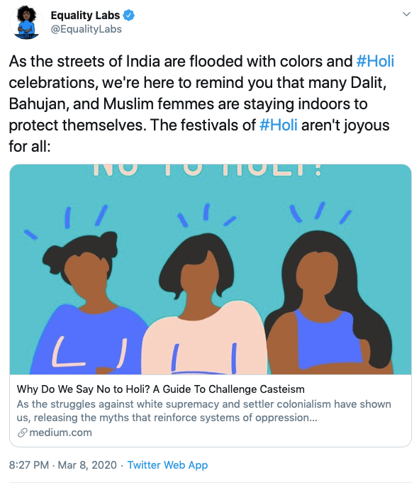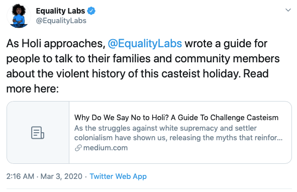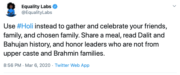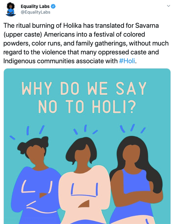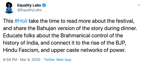 Equality Labs Political Director is Sharmin Hossain, a Bangaldeshi-American who has utter contempt for Hindus and India. Equality Labs is one of the propaganda outlet used by Hindu haters and breaking India forces. Their Uppercaste and Brahmin hate has put many Indians in the US at risk. They actively protested against India’s Citizenship Amendment Act, called Delhi riots ‘anti-muslim pogrom’, and support ‘free Kashmir’ movement. In 2020, Equality Labs made a twisted version of Holi being casteist, connected it to Upper caste and Brahmin supremacy and the rise of BJP and Hindu Fascism. Equality Labs is using Hindu festivals to spread Hindu hatred among unsuspecting people in the West.