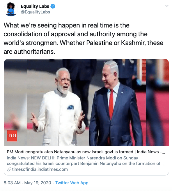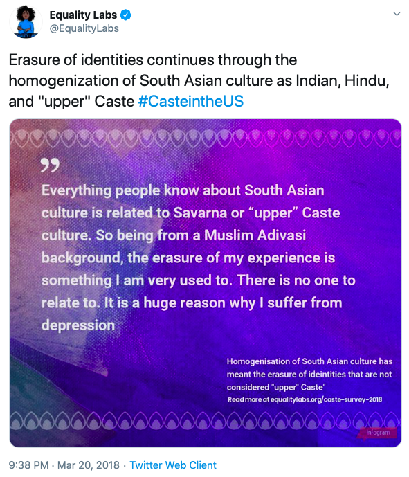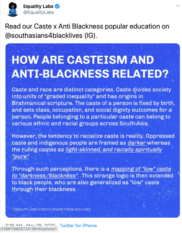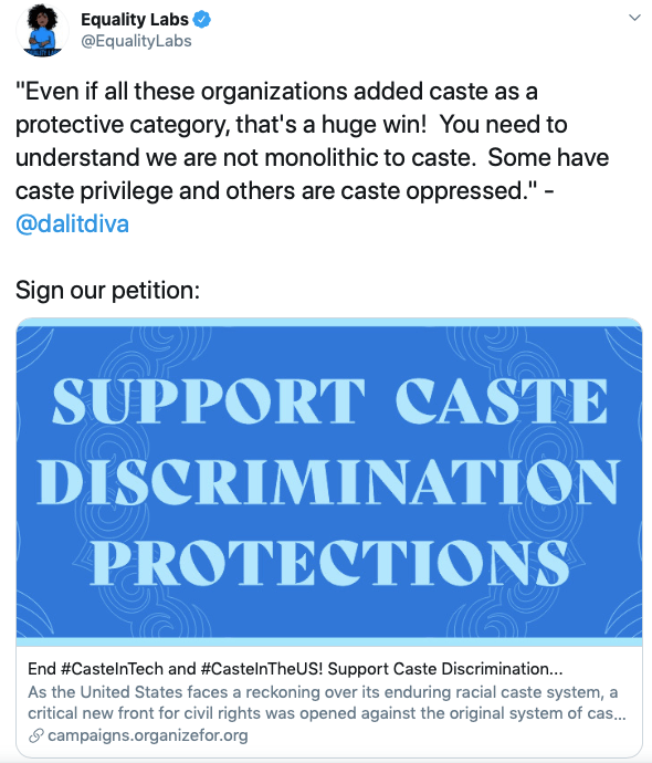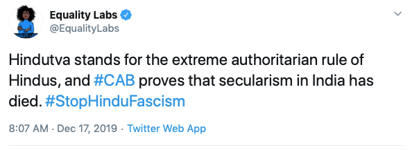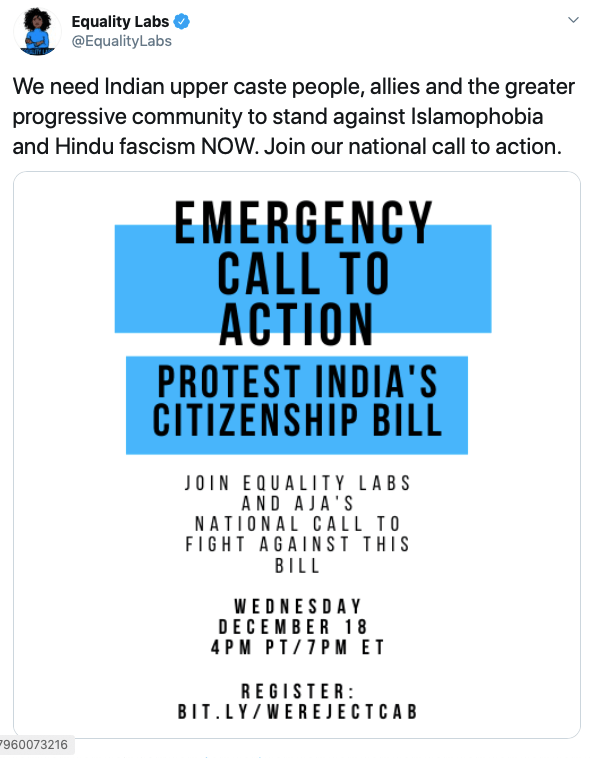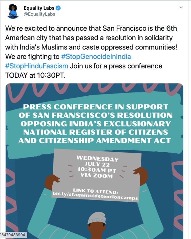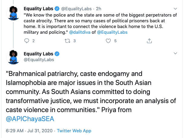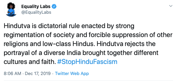 According to their website Equality Labs is “is an Ambedkarite South-Asian progressive power-building organisation”. It’s members include Dalits, Bhaujans, Adivasis, Muslim, Buddhists, Sikh and Christian South-Asians. Glaringly missing are Hindus, Jains and the real minority Parsis. According to Equality Labs they use community research, cultural and political organising, popular education and digital security to fight the oppressions of caste apartheid, Islamophobia, white supremacy, and religious intolerance.