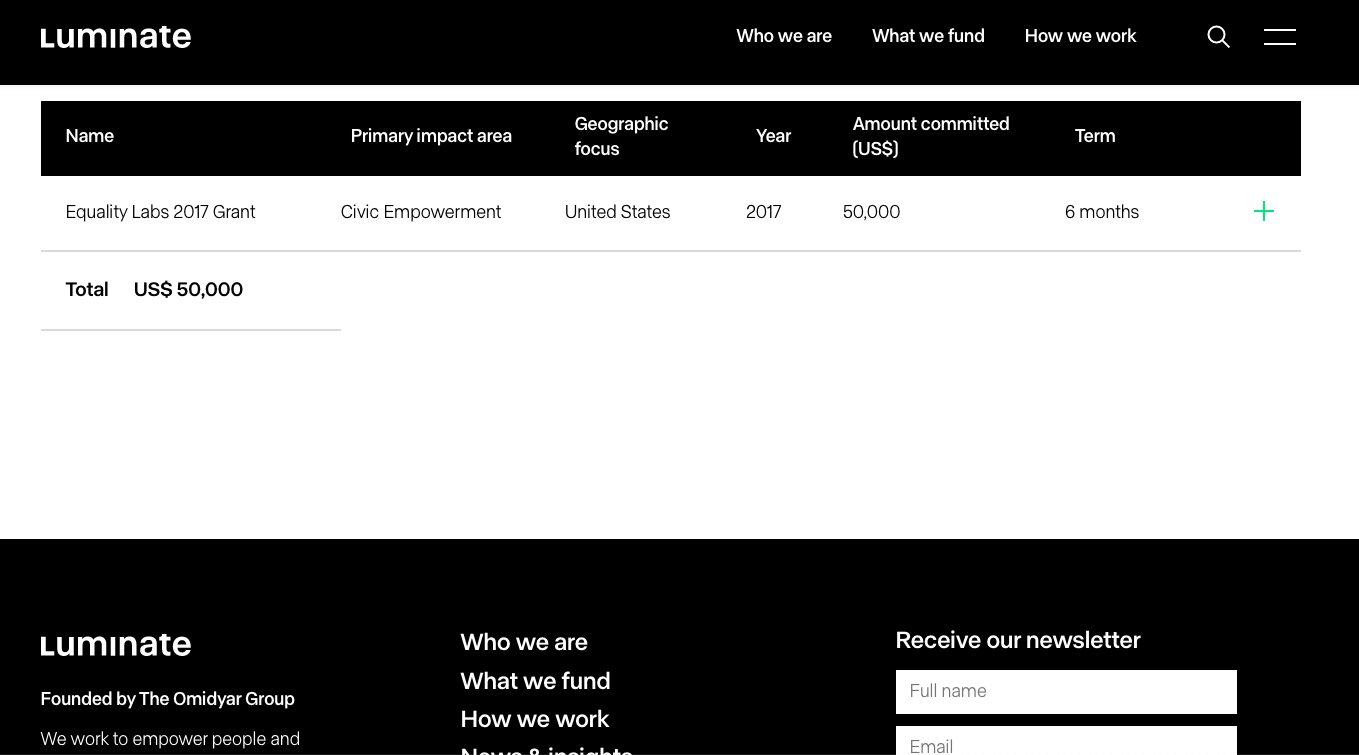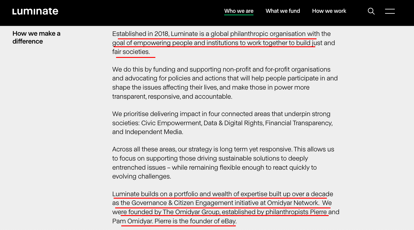 In 2017, Equality Labs received a grant of US $50,000 from Luminate. Until 2017, Luminate was Governance and Citizen Initiative at Omidyar Ntework. they were founded by The Omidyar Group. In 2018 they became Luminate a ‘global philanthropic organisation’.