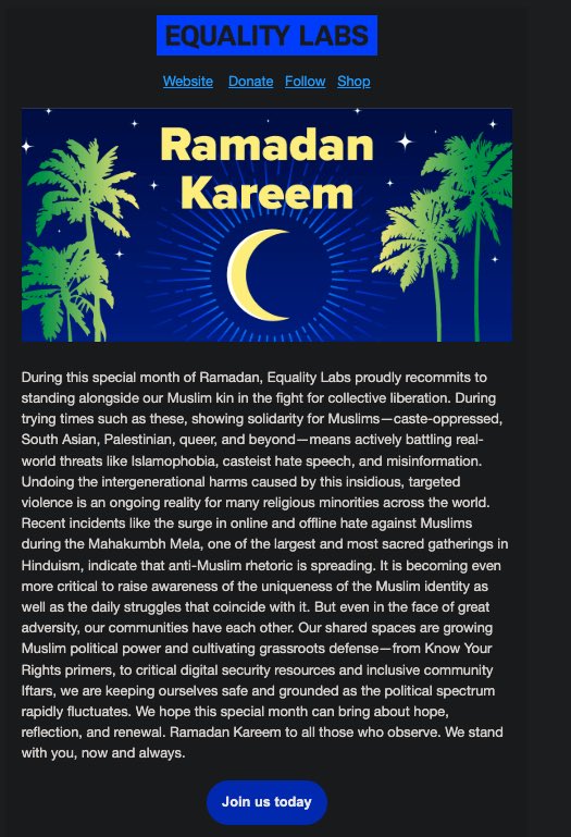 In 2025, Equality Labs put out Ramadan greeting that called Mahakumbh Mela ‘Islamophobic‘. It read “Recent incidents like the surge in online and offline hate against Muslims during the Mahakumbh Mela, one of the largest and most sacred gatherings in Hinduism, indicate that anti-Muslim rhetoric is spreading.”