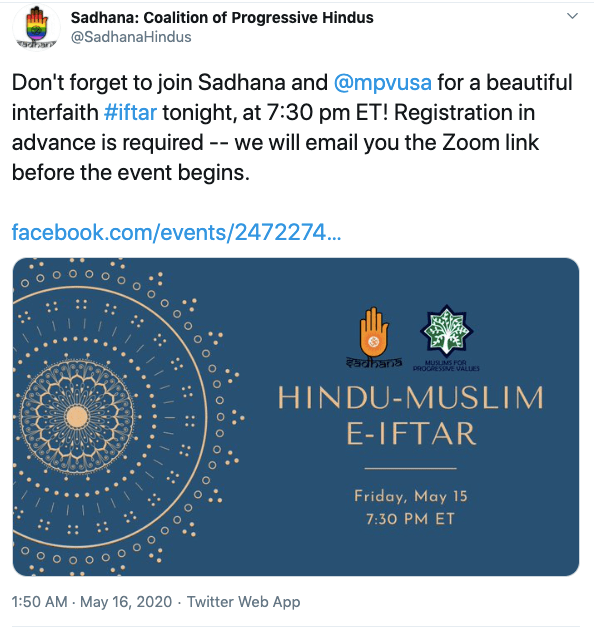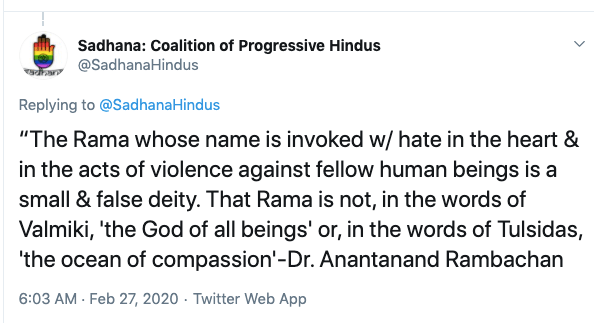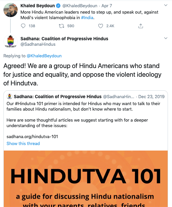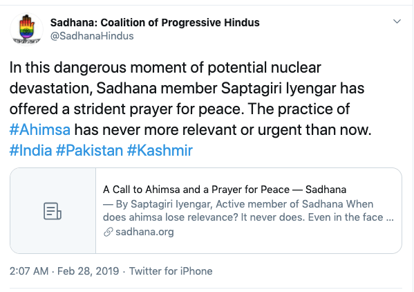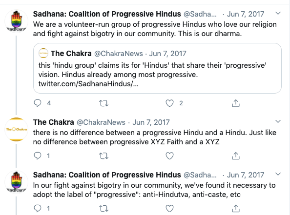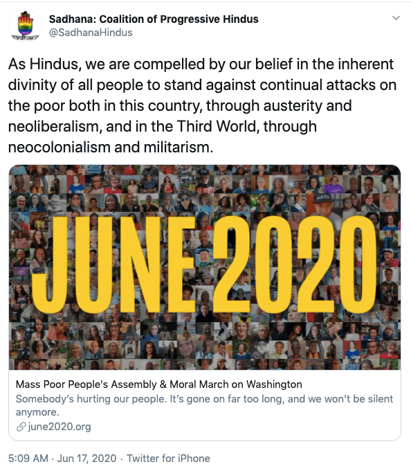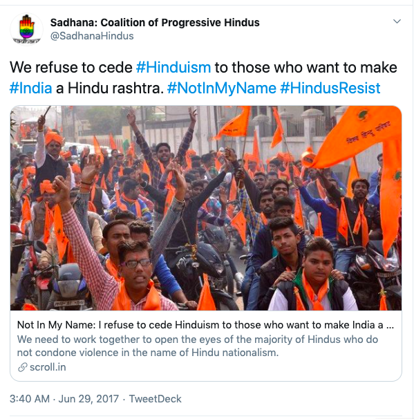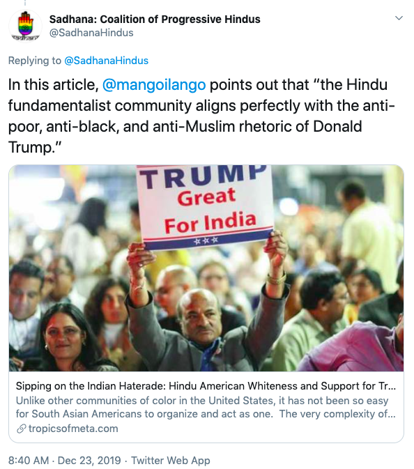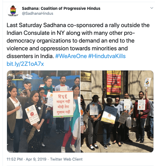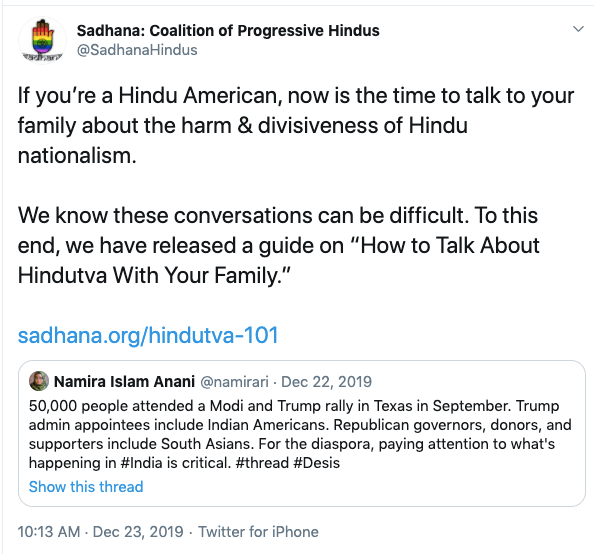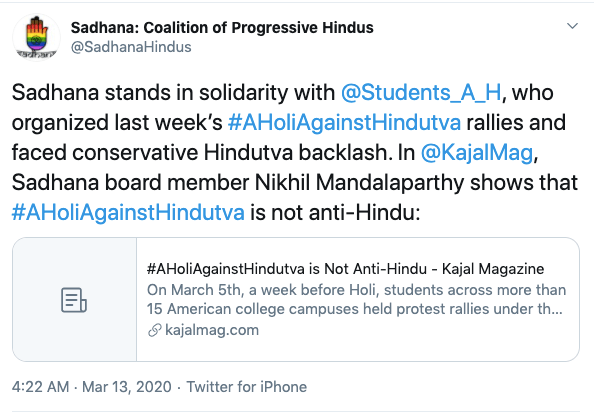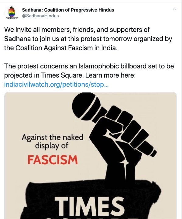 Sadhana is an anti-Hindu, anti-India organisation operating from the United States headed by Sunita Viswanathan, who also heads Hindus for Human Rights. Sadhana is not a Hindu organisation nor does it work for Hindu causes. Sadhana has been a staunch supporter of anti-India forces and has participated in anti-CAA protests along with Islamic fundamentalist organisations, Christian evangelical churches and communist led organisations. They have never argued in favour of religious persecution of Hindus and Sikhs in Pakistan, Afghanistan or Bangladesh. They support Kashmir separatism and have again never spoken about Kashmiri Hindu genocide. Sadhana’s co-founders along with Sunita Viswanath are Aminta Khilawan-Nariane and Rohan Nariane.