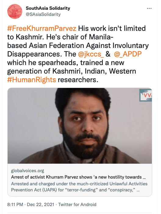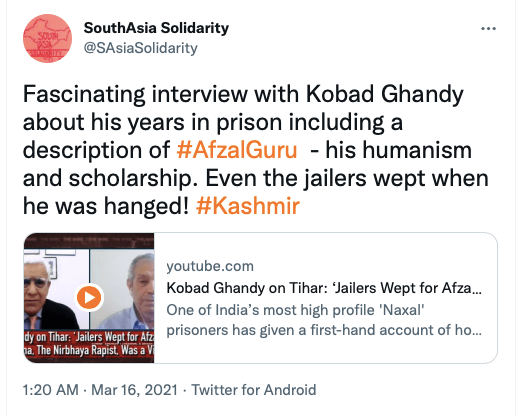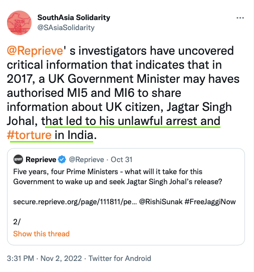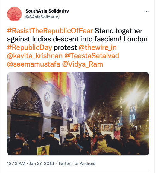 SASG have supported terrorists and sympathised with terror groups calling Afzal Guru ‘innocent’, LeT terrorist Burhan Wani’s killing as ‘extra-judicial execution’, called killing Lashkar e Tayyaba’s Ishrat Jahan as ‘murder’ by the Indian state and Khalistani terrorist, Jagtar Singh Johal‘s arrest as ‘unlawful’. SASG also have been working along with Khalistanis in the UK. From writing for Khalistani news portal ‘Sikh Siyasat‘, to protesting with them against Indian government in London, SASG have called for the release of Jagtar Singh Johal alias, Jaggi, a member of the terror group, Khalistan Liberation Front.