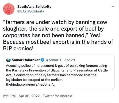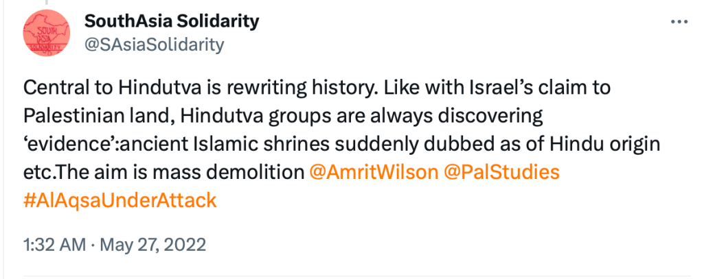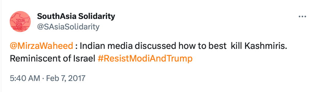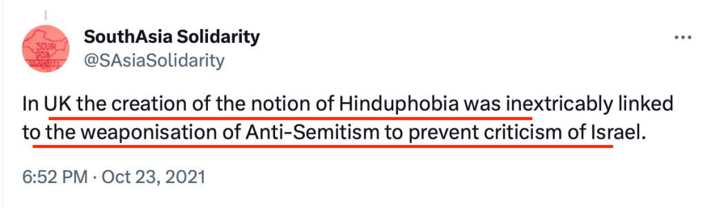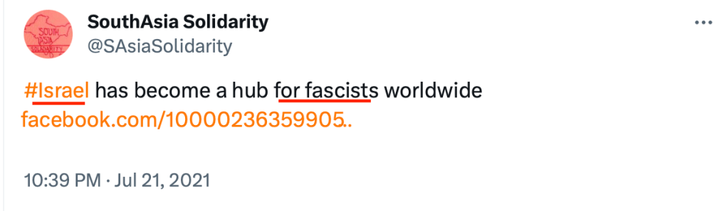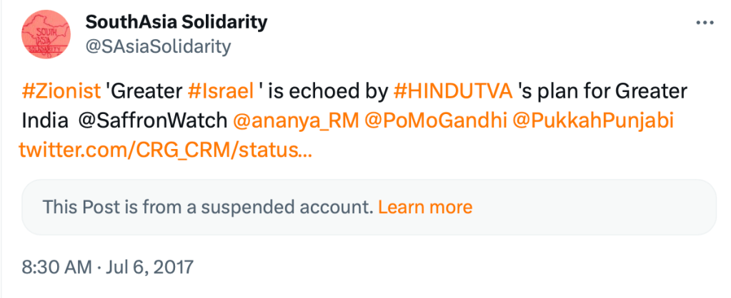 In the recent Hamas terror attack on Jews in Israel, SASG came out in support of Palestine and their rape and murder of Jews women and families. They have often eqauted India with Israel and Hindutva with Zionism along with calling India and Israel as ‘fascist state’, occupier and settler.