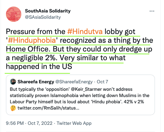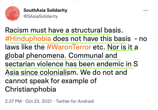 SASG has a number of times previously denied the existence of hatred for Hindus or Hinduphobia. They claimed that Hinduohobia is a myth, has no historical or structural basis, is a spurious notion or is not a global phenomenon.