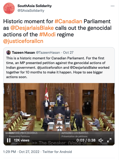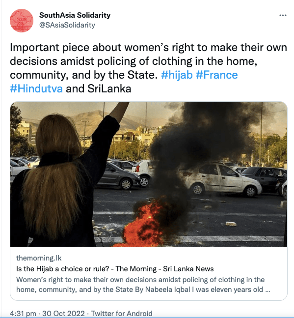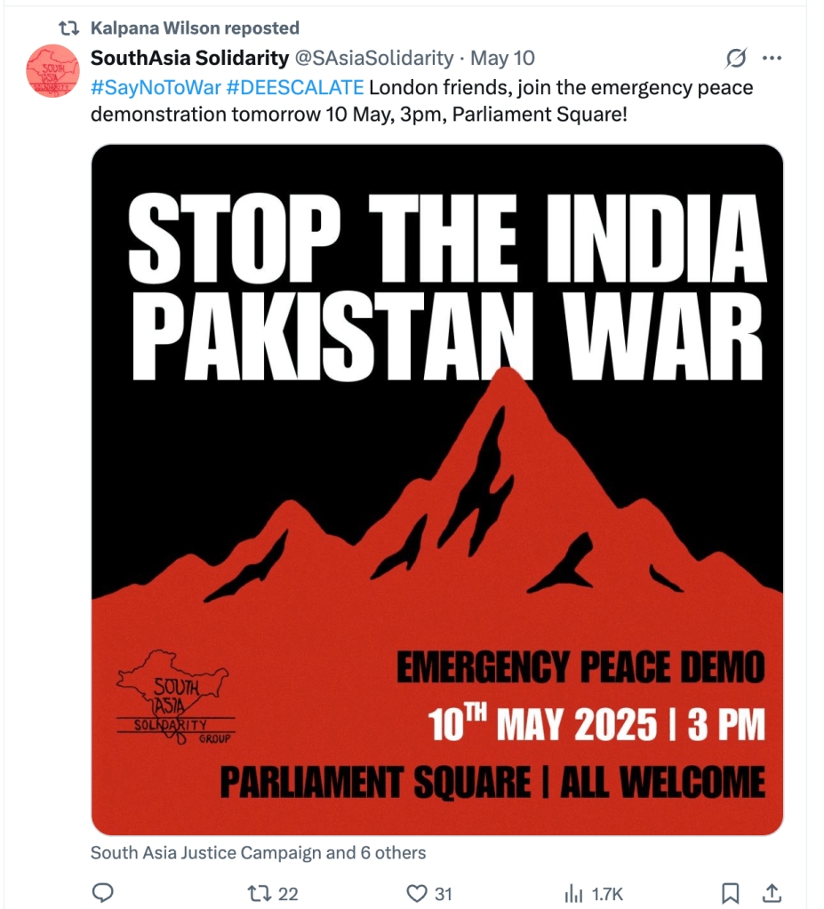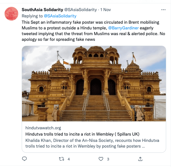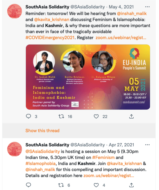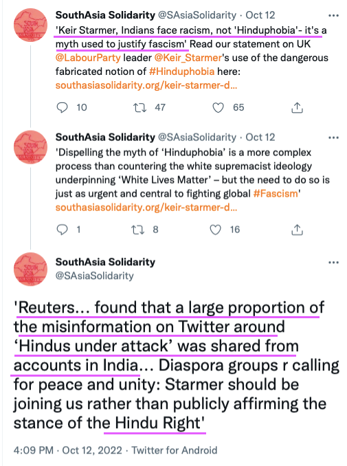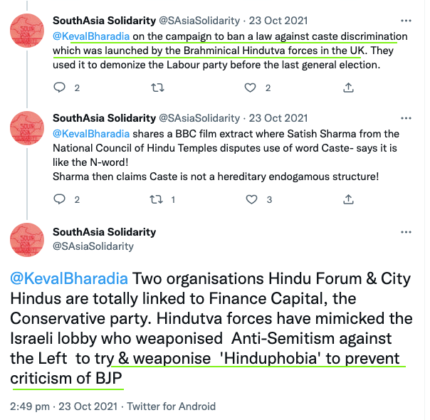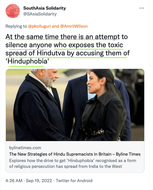 In 2022, SASG blamed Hindus in Leicester for violence against them even when there was overwhelming evidence on video and speeches made by Islamists against Hindus, Islamists calling for mobs from outside Leicester via Instagram, fake news peddled by ex-ISIS/AQ recruiters like Majid Freeman calling Hinduphobia to be “….comparable to White Lives Matter”. SASG also attacked Britain’s first Hindu Prime Minister, Rishi Sunak, of Islamophobia, racism, poverty and Hindutva. Amrit Wilson has often appeared in panels and programmes organised by Islamic Human Rights Commission (IHRC), a group that been flagged by counter-terrorism groups to be associated closely with the current Iranian regime. IHRC has extended support to terror groups such as Hzbollah, Hamas and Popular Front for the Liberation of Palestine.