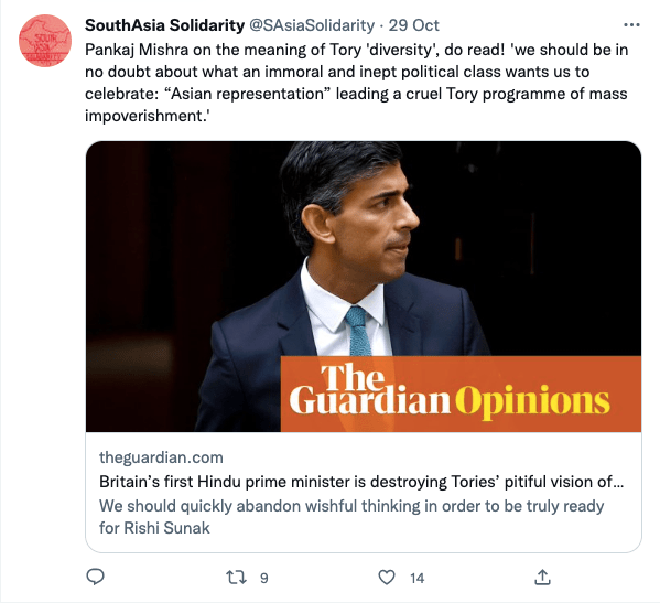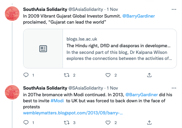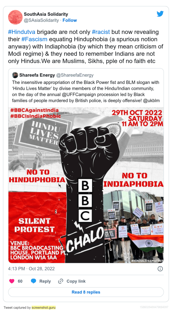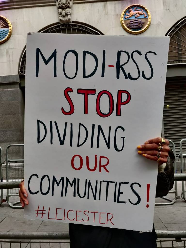 The right-wing UK government ministers Priti Patel, Rishi Sunak and Alok Sharma are all acolytes of Modi, and the HSS (the international wing of the openly fascist RSS, of which Modi is a lifelong member) and other Hindu-supremacist organisations are actively spreading hate in the UK”. South Asia Solidarity Group, Resign Modi; Activists drop banner on London’s Westminster Bridge, 15th August 2021, Maktoob Media