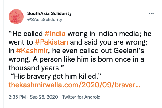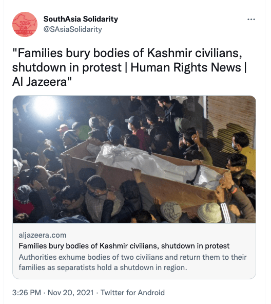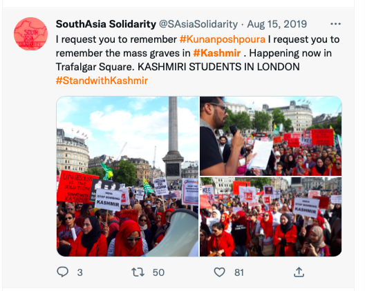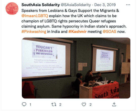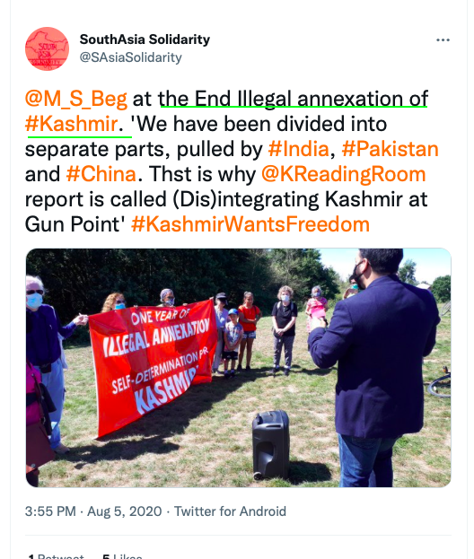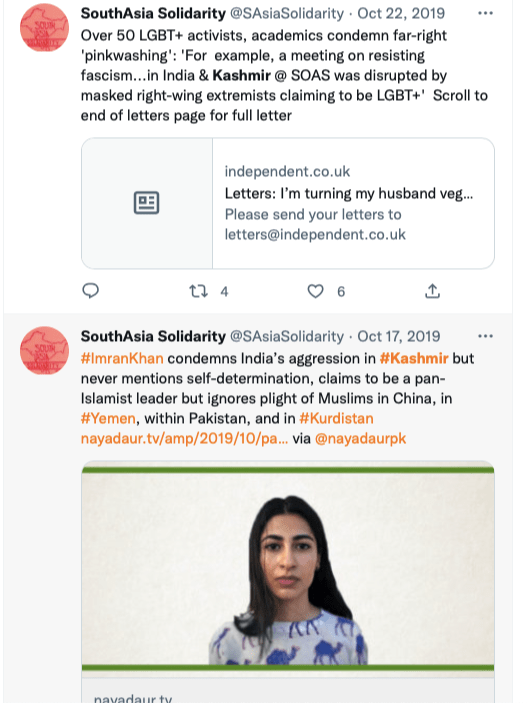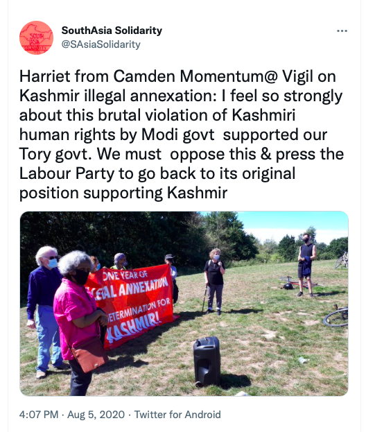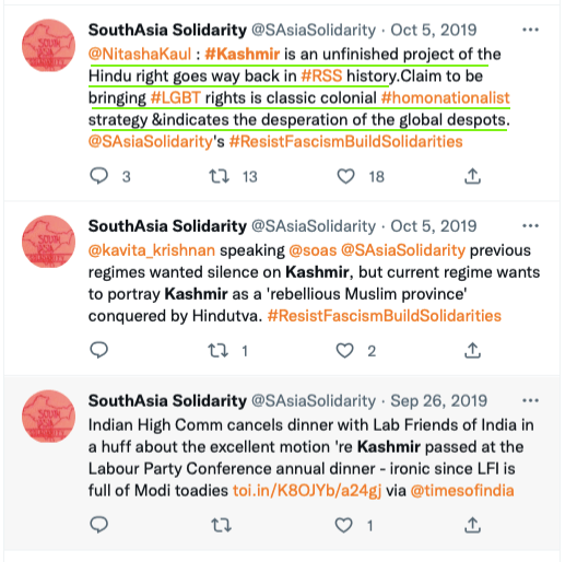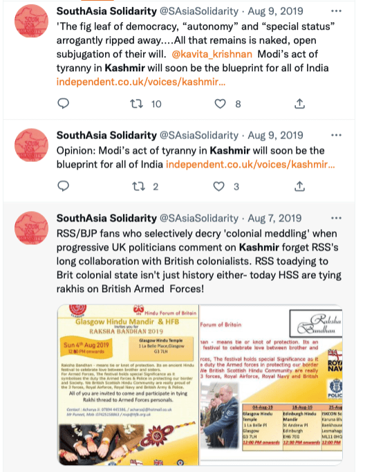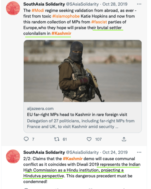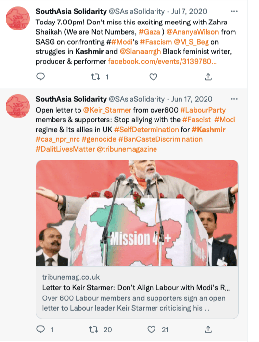 SASG have been campaigning for the separation of Kashmir from India. They have built and propagated false and fabricated stories of human rights abuses by Indian army forces via campaigns, vigils, events, and protests. They objected to UK’s Labour leader, Keir Starmer’s assertion that “….Kashmir is “a matter for the Indian Parliament”” and have accused the leader of forming ties with Hindu Forum of Britain (HFB) who SASG accuses of being closely linked with “far-right and Hindu supremacist government in India”. Calling the abrogation of Article 370 and 35A “illegal” and against India’s Constitution, in another article SASG said “……..non-Kashmiri settlers will be able to take over the land”. They concluded the article with the words: