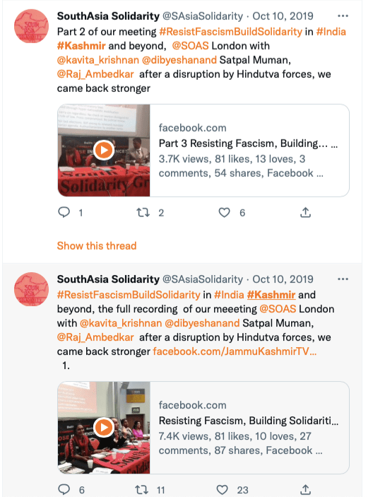 Founded in 1987 by Amrit Wilson and her daughter Kalpana Wilson, South Asia Solidarity Group (SASG) has other members like a former LTTE member from Sri Lanka, Nirmala Rajasingham, Keval Bharadia, Saunvedan Aparanti, Sangeeta Kalia, and Shruti Iyer, currently pursuing Law from the University of Oxford. As per their website, SASG is an “anti-imperialist, anti-racist organisation based in Britain. We are committed to supporting, publicising, and building solidarity with people’s struggles for justice and democracy and against exploitation, gender and caste based oppression, imperialism, war and the so-called ‘war on terror’ in the countries of South Asia.” SASG is also part of International Solidarity for Academic Freedom in India (InSAF) and Awaaz Network.