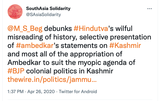 In a tweet on Pulwama attack, SASG quoted an article from the much maligned, The Wire, equated the death of Indian security forces with the death of terrorist and Pulwama bomber, Adil Ahmed Dar. SASG also gave a free-pass to terrorist Adil Ahmed Dar while trying the pin the blame of the attacks on the Indian government. They shared an written by CPI(ML) which essentially accused the Indian government of conducting a “false flag operation” in Pulwama to win the upcoming state elections.