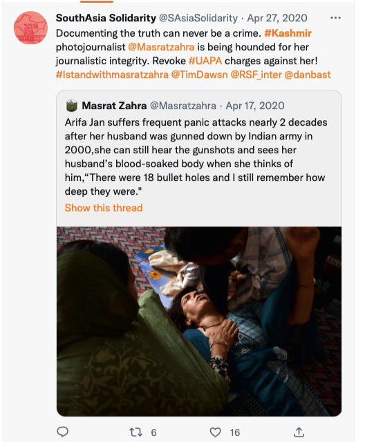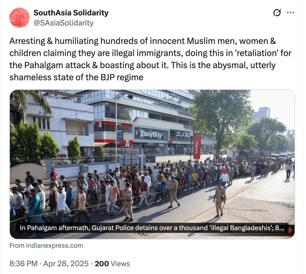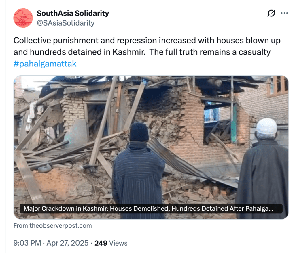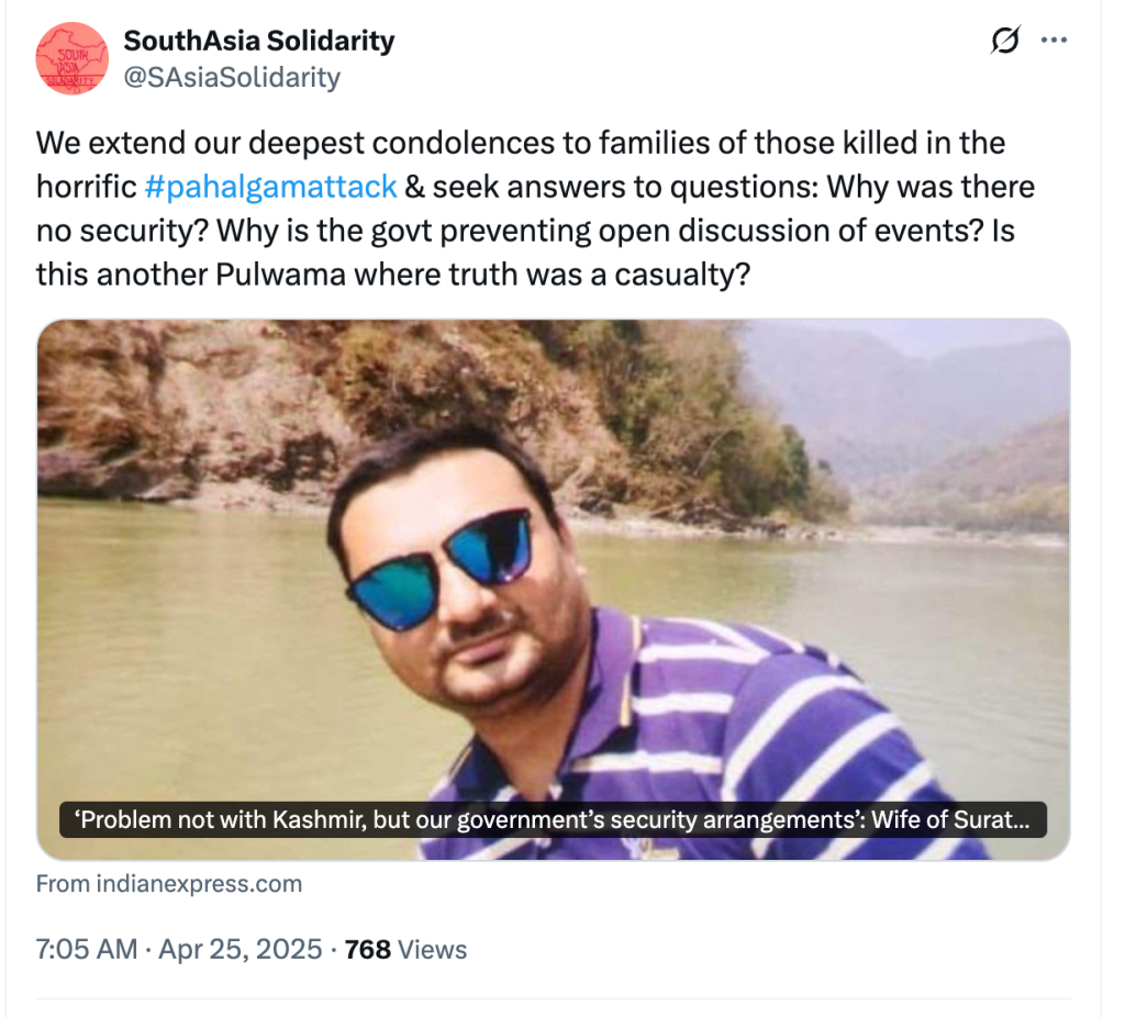 In 2025, SASG and its founders failed to condemn the terror attacks on Hindus in Pahalgam, Kashmir. Immediately after the attacks, SASG and its members diverted the attention from Hindus towards Muslims painting Kashmiris and Indian Muslims as the real victims. They also came in support of terrorists accused of the Pahalgam terror attack, government of India’s response to send back Pakistani nationals in India, and were against the suspension of Indus Water Treaty. In one of their posts on X, SASAG insinuated that the terror attack was another Pulwama like incident – a false flag operation.