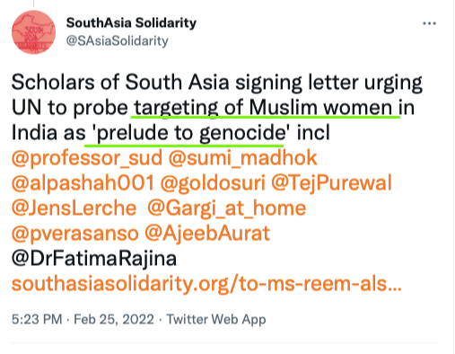 SASG also added fuel to fire during the farmers protests, fanned the ‘ethnic Muslim cleansing‘ calls internationally for passing the humane Citizenship Amendment Act (CAA), protested against setting up of Sterlite copper plant in Thoothukudi, supported Church-backed protests against setting up of Kundankulam nuclear power plant, protested against removing Mohammed Ali Jinnah’s portrait from Aligarh Muslim University, supported and promoted the bigoted ‘Dismantling Global Hindutva’ conference in 2021.