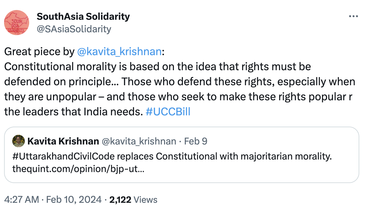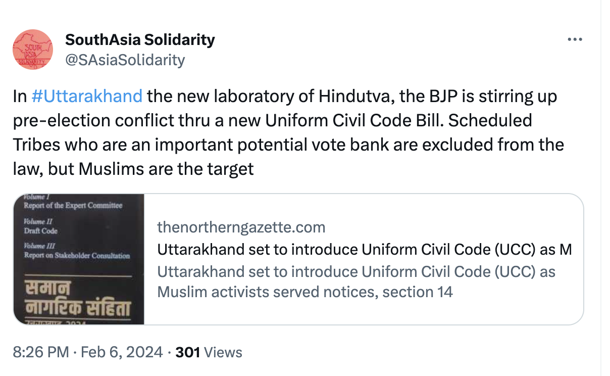 Opposing the adaptation and implementation of Constitutionally valid Uniform Civil Code in the state of Uttarakhand, SASG has vehemently oppose uniform civil laws because according to them they are “Muslims are the target”, “furthers a Hindu supremacist, patriarchal agenda and reinforces….gender inequality”.