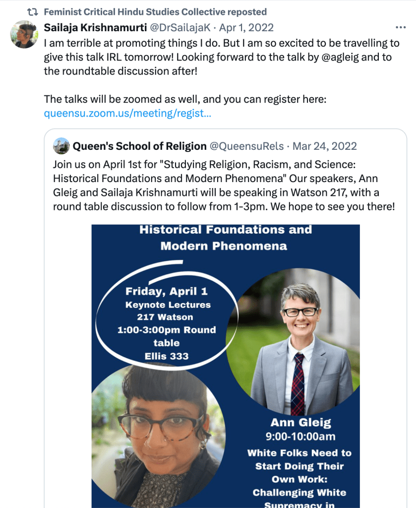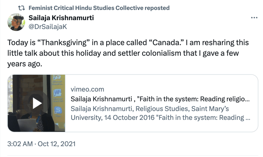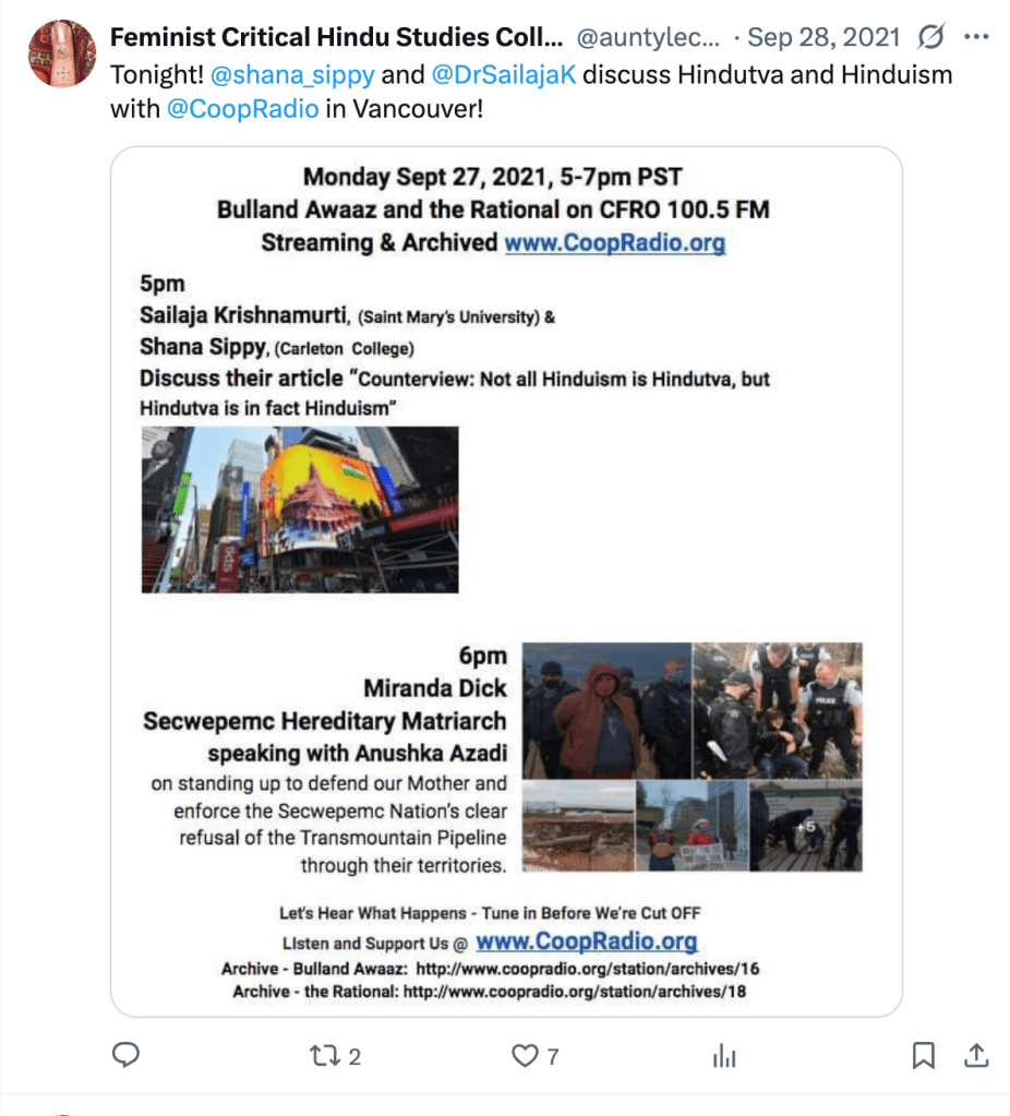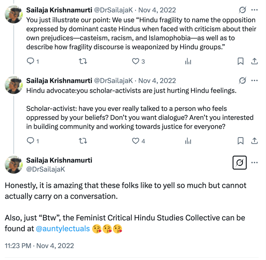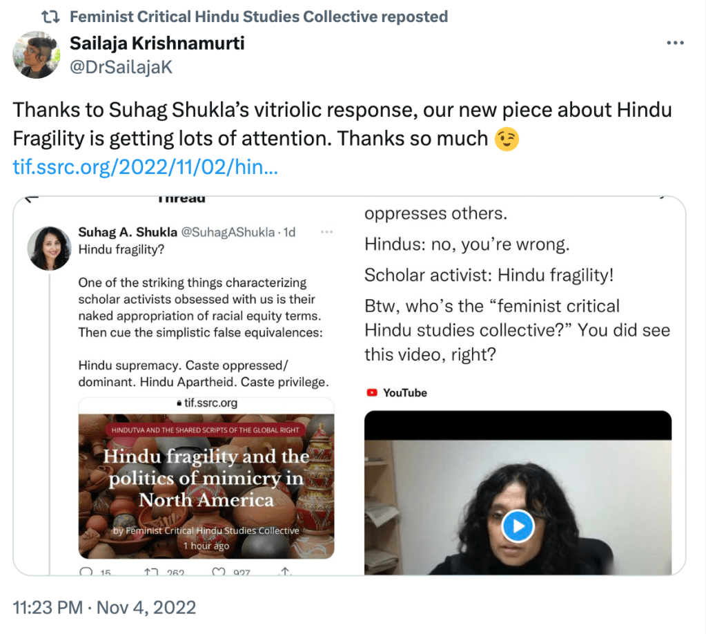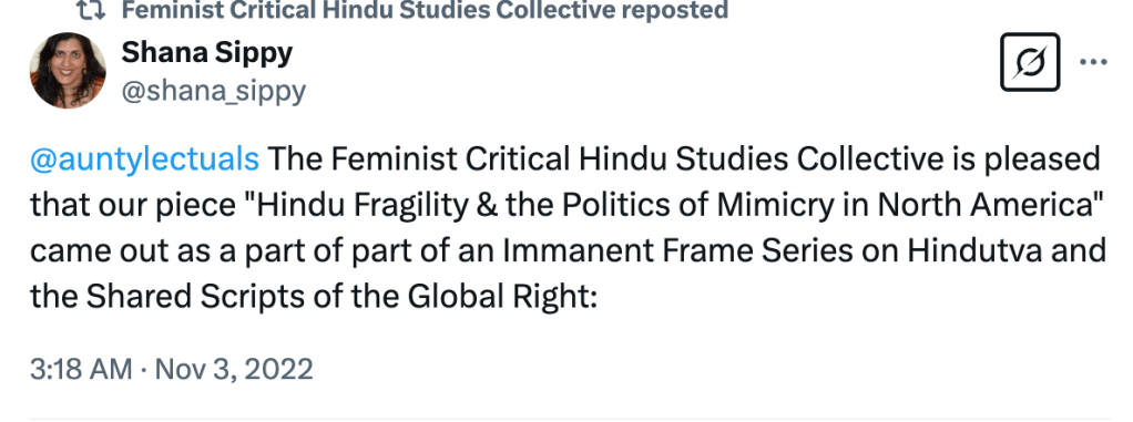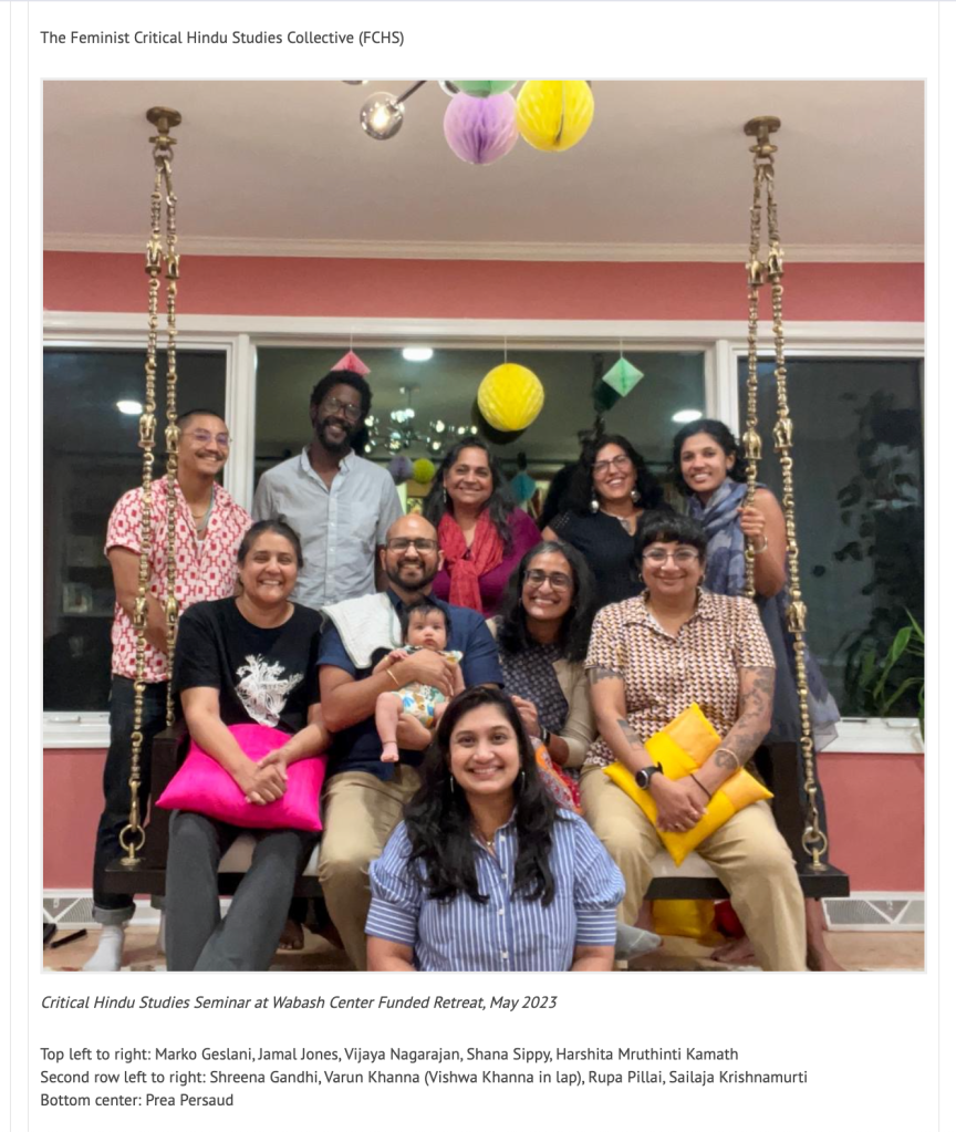 In “Feminist Critical Hindu Studies in formation“, they outline the philosophy, methodology, and aim of the Collective. They seek to uncover the visible structures of “the regulation of sexuality and gender, and the violence of caste” on which Hinduism and Hindus studies rest. They write “We use the concept of Hindu formations to complicate the notions of “Hinduism” and “Hindus” as categories that not only arise in conjunction with forms of white supremacy and caste supremacy, but are imbricated with them.”