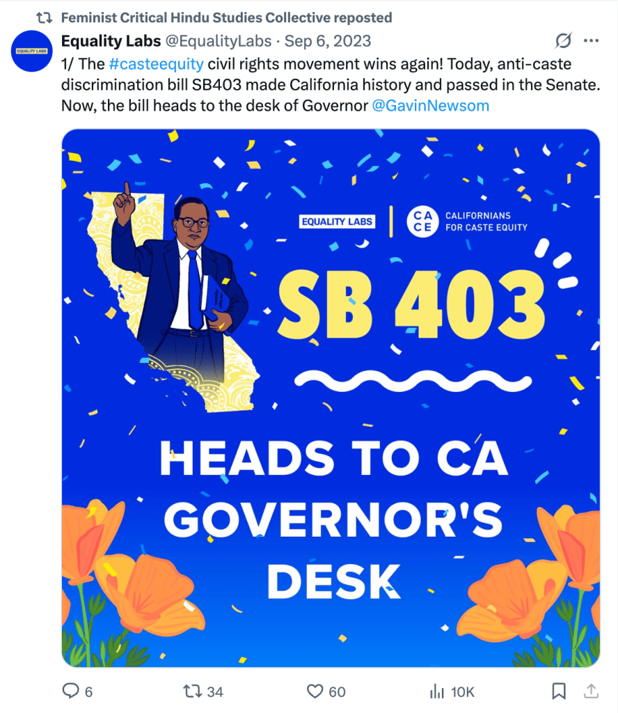 In “Hindu fragility and the politics of mimicry in North America“, FCHS draws parallels between White supremacy and Hindutva. They write, “By examining contemporary debates around caste in the United States, we illustrate how Hindu fragility—an expression of Hindu supremacist logics—is weaponized and performed by North American Hindus, mimicking white supremacy culture and propagating everyday Hindu nationalism.” They argue that in North America, Indians as “model minority” is a myth that presents Hindus are victims of discrimination and not as perpetrators of discrimination. They describe Hindu fragility as “Hindu fragility then refers to how caste-privileged Hindus leverage ideas about their collective precarity and vulnerability, making it seem that any criticism of Hinduism or India harms Hindus and enacts violence against the community.” They further state that Hindu groups practice “homohindunationalism” that expresses “solidarity with LGBTQ+ groups but reject working with anti-caste groups.” They mention the Indian Union territory of Jammu & Kashmir as “occupied by India”. In conclusion they write “Caste supremacy in South Asia and South Asian diasporas, which has been sustained over thousands of years through a wide-array of religious texts and practices as well as economic and social structures, upholds brahminical patriarchy at the expense of caste-oppressed communities, religious minorities, and others not included in the vision of Hindu supremacy.”