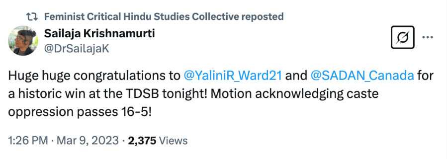 The FCHS wrote an article “Hinduphobia is a smokescreen for Hindu nationalists” in which they write, “We became involved as organizers because we have privilege as American and Canadian citizens and as people who benefit from caste privilege.” They write that “Hindutva is a political movement that claims that only Hindus can be legitimate citizens of India, excluding India’s thriving Muslim, Dalit, Bahujan and Adivasi communities.” According to them, “There is little evidence that Hindus on university campuses face widespread religious persecution, and their use of “Hinduphobia” is little more than a smokescreen. The term co-opts the language we use as social justice activists to challenge racism, white supremacy, casteism and Islamophobia, even as Hindu nationalists claiming victim status troll and threaten South Asian studies and Hindu studies scholars. The term, and the violent rhetoric employed by Hindutva supporters, is built on misinformation and fear, which are classic tools of fascism everywhere.” They write that “challenging a casteist, Islamophobic way of being Hindu does not equate to Hinduphobia.”