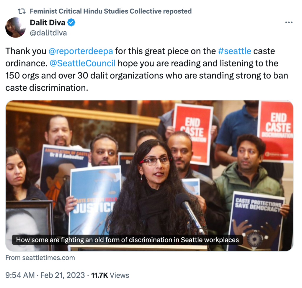 The FCHS wrote a letter to the Seattle City Council in support of the ordinance proposed by Kshama Sawant to ban caste-based discrimination. In the letter, they assert that “Hinduism and Hindu—not only arise in conjunction with forms of white supremacy and caste supremacy but are imbricated with them.” They argue that any Hindu advocacy group that opposes the caste bill is “aligned with right-wing ethnonationalist movements in India.” The authors base their argument on a caste survey conducted by Equality Labs that was flawed, unscientific and fabricated and specifically conducted to portray a skewed picture of caste in the US.