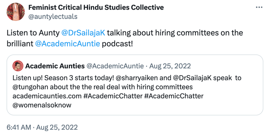 The FCHS’s “Auntylectuals: a nonce taxonomy of aunty-power“, explore the “possibilities for upending the hegemonies that persist in South Asian culture, and in South Asian Studies. We are acutely aware of the need to resist Hindutva and Islamophobia and interrogate what is at stake in South Asian invocations of aunty.”