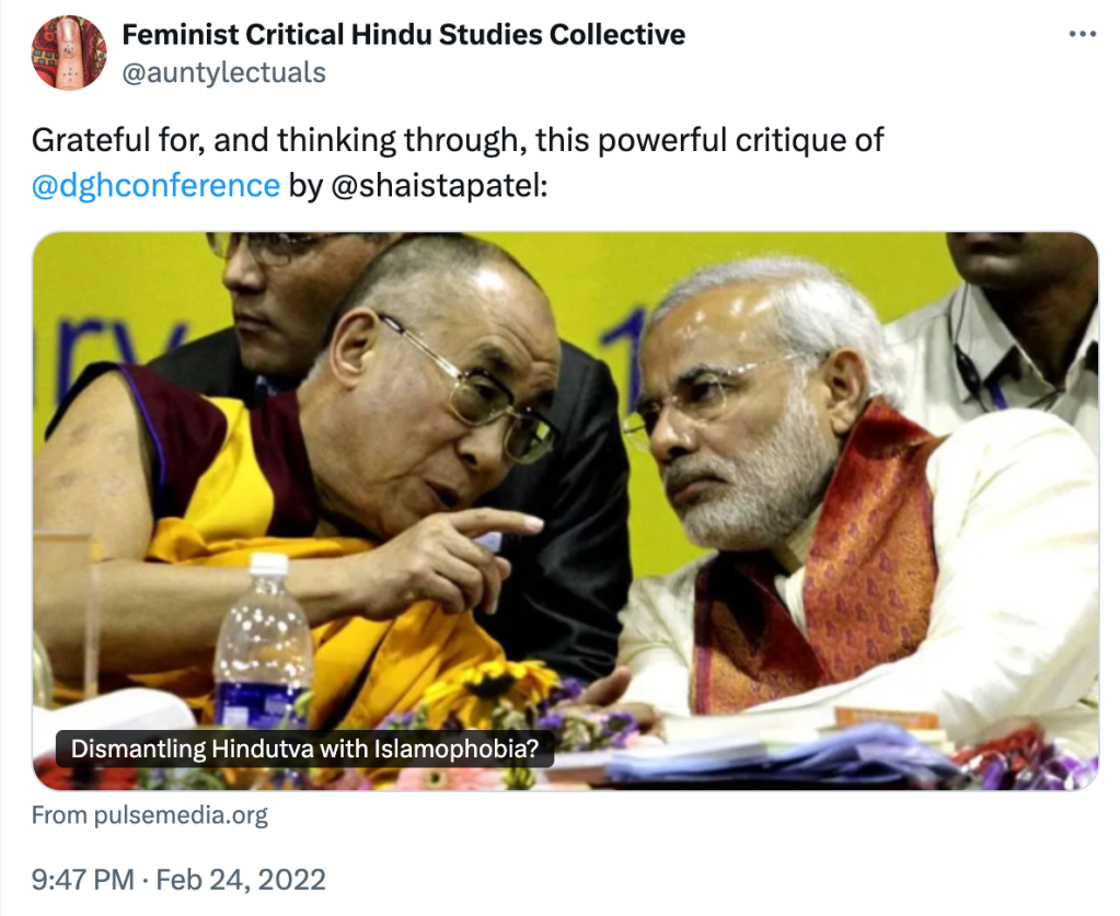 Some of their members were speakers at the Dismantling Global Hindutva Conference where they equated Hindutva with Hinduism despite the event organisers claiming the opposite.