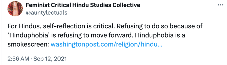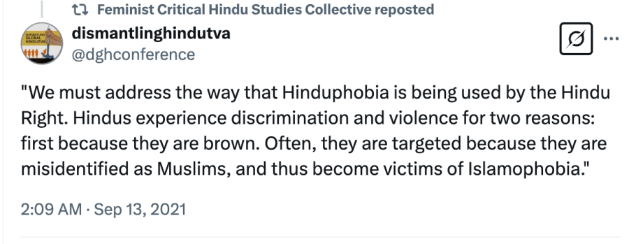 In a bizarre article “Not all Hinduism is Hindutva, but Hindutva is in fact Hinduism” by Shana Sippy and Sailaja Krishnamurthy, the authors, “assert that although not all Hinduism is Hindutva, Hindutva is in fact Hinduism. We believe strongly that we must begin not by denying the Hinduness of Hindutva but by realising that Hindutva is a powerful, vocal, and insidious form of Hinduism.” On the issue that some global institutions and organisations wish to celebrate Hindu identity which according to them bolsters “Hindutva’s aims”. The authors argue that the notion of a Hindu identity “is a fairly recent construction that has been shaped by colonialism and nationalism” and that a Hindu identifying as Hindu signals “that one is not something else” which produces, “the hate that we see in Hindutva’s many forms.” Sippy and Krishnamurthy contend that Hinduphobia is a fabricated concept and a smokescreen for Hindutva, suggesting that the discrimination faced by Hindus in Western countries arises from being wrongly perceived as Muslims, hence they are victims of Islamophobia. The authors conclude by stating that to address the issue of Hindutva, “we must first recognise that Hindutva is indeed a part of Hinduism.”