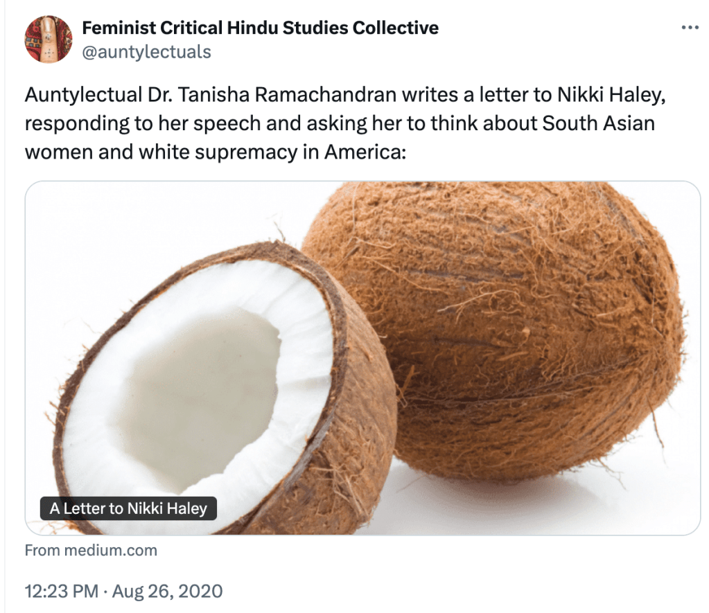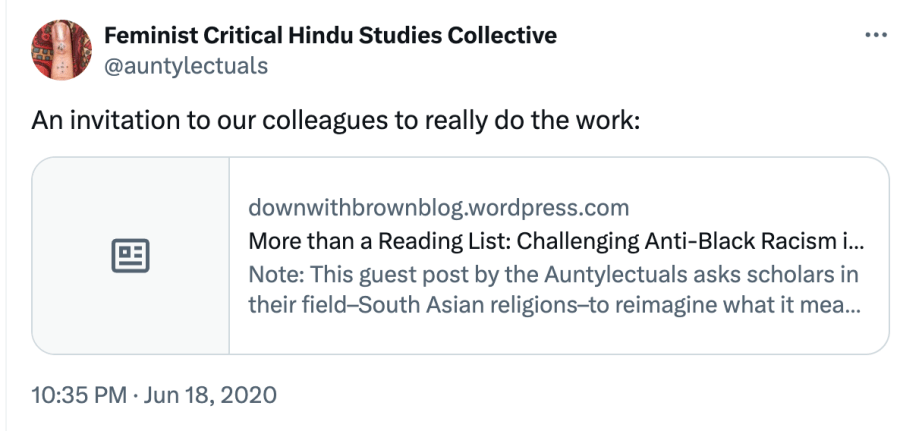 In their first article as FCHS, “More than a Reading List: Challenging Anti-Black Racism in the Field of South Asian Religions“, they agree that any study of South Asian religions should “integrate gender and race” along with critical race theory, gender, and sexuality studies into their classes and research. They contend that the study of South Asian religions was formed by “white supremacy, brahminical supremacy, and hetero-patriarchy”. They write, “racism, anti-Blackness, sexism, casteism, Islamophobia, and orientalism inherently inform the scholarship on and pedagogy of South Asian religions.” Indians are perceived as “model minority” in the US which the authors believe the status is “rooted in anti-Black racism.”