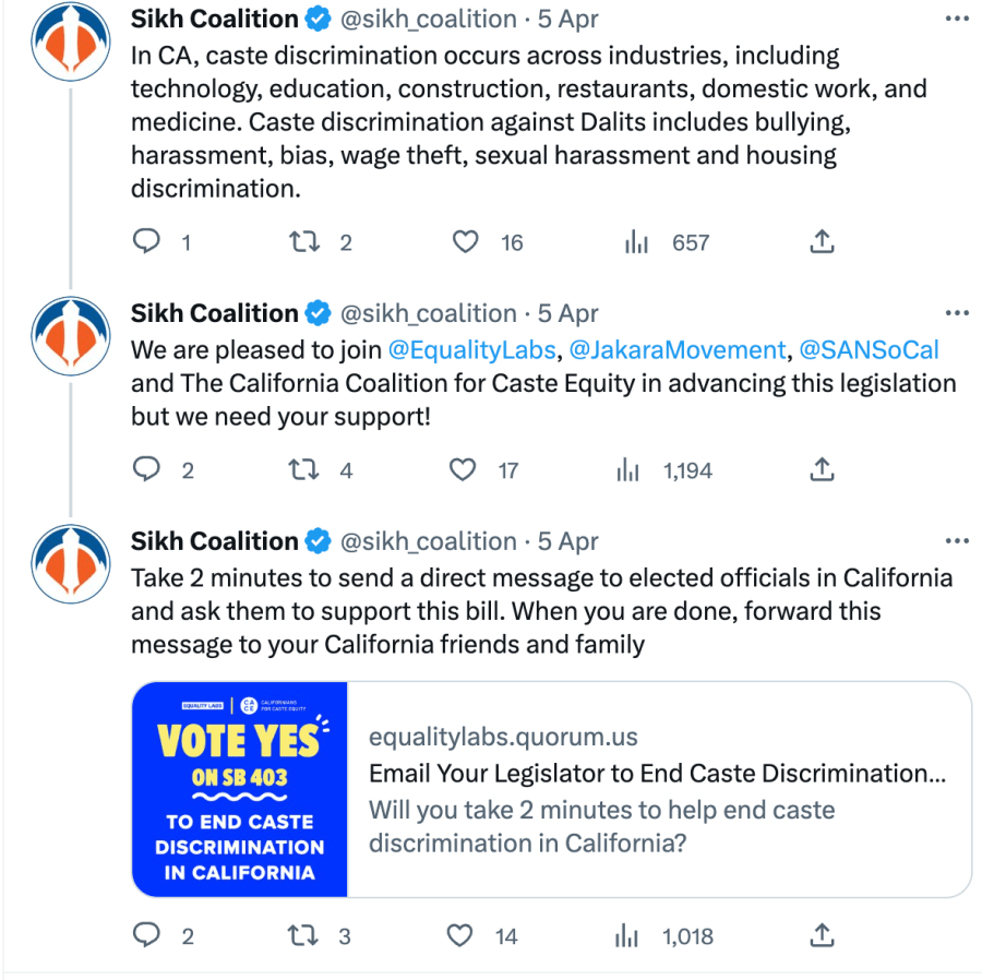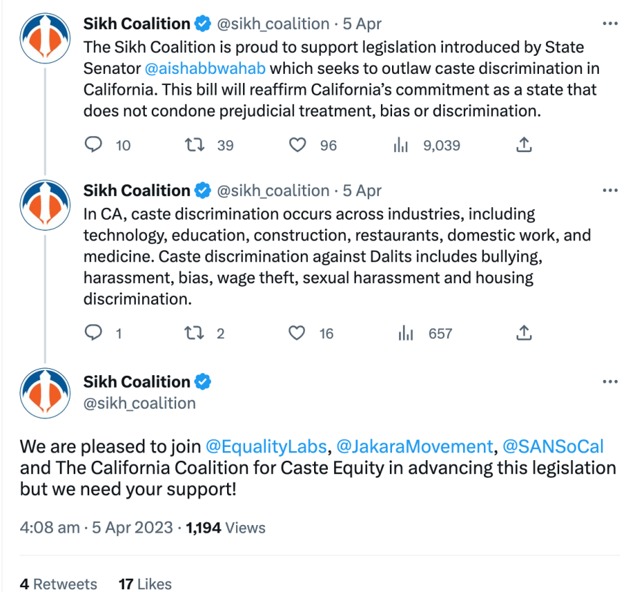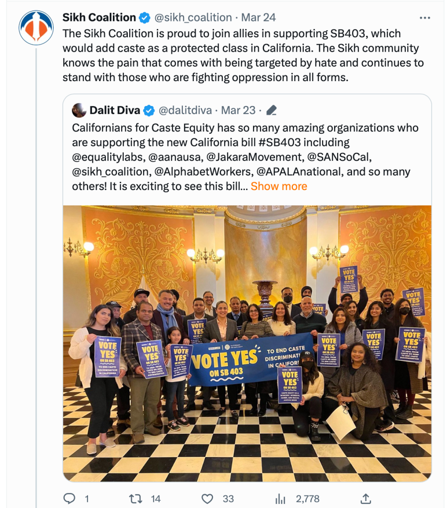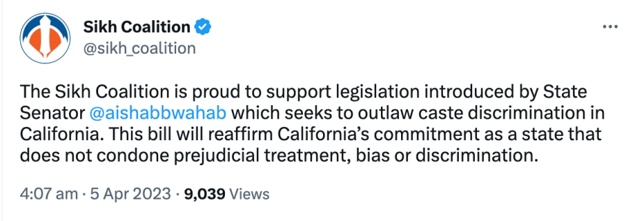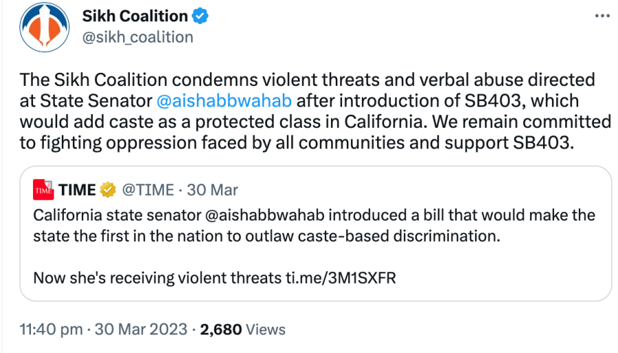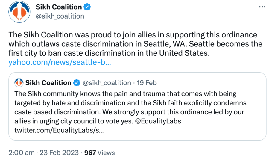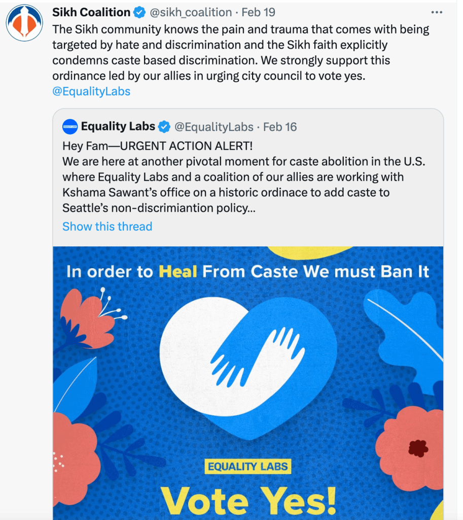 In 2023 Seattle’s anti-caste discrimination bill was brought in by radical communist Council member Kshama Iyengar Sawant, The Sikh Coalition joined anti-Hindu forces to pass the bill. The Sikh Coalition has also supported the California caste discrimination bill brought in by Afghan Senator Aisha Wahab.
