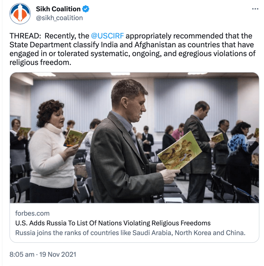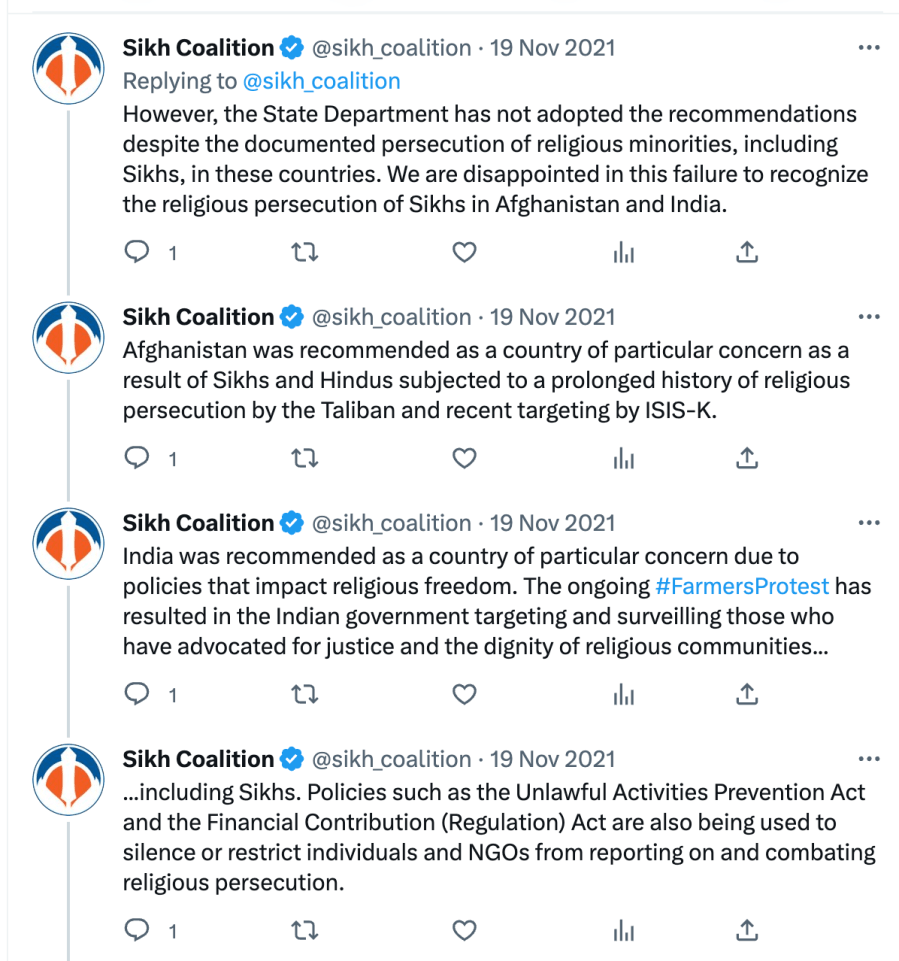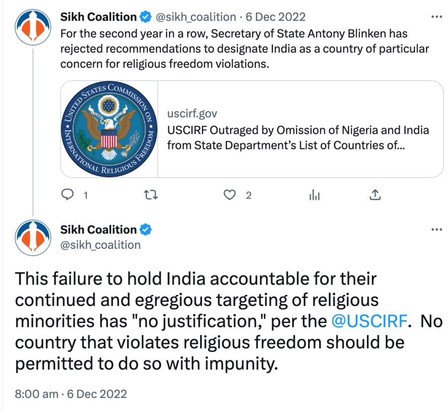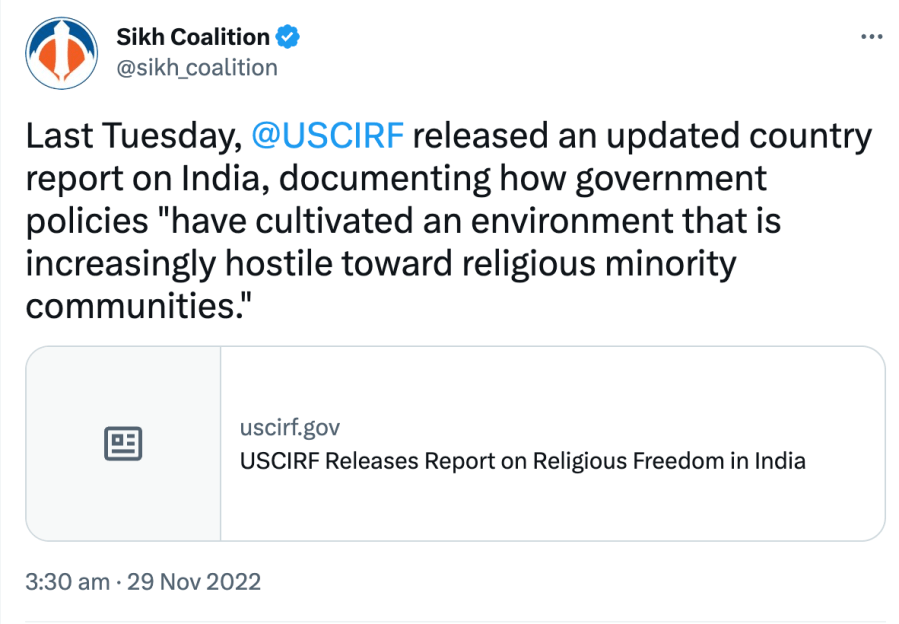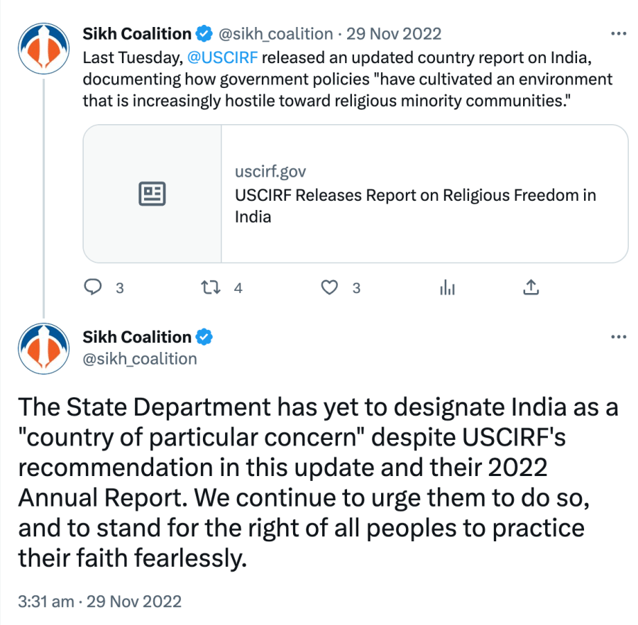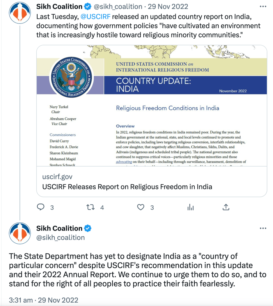 Since 2021, The Sikh Coalition has been recommending India be placed under ‘Countries of Particular Concern’ for being “engaged in or tolerated systematic, ongoing, and egregious violations of religious freedom.” They also claim Sikhs are being persecuted in India even though India has had a Sikh Prime Minister, President, Governors, Chief Ministers, Cabinet Ministers, Army Chiefs, doctors, engineers, lawyers, sports team captains, actors, singers, etc.