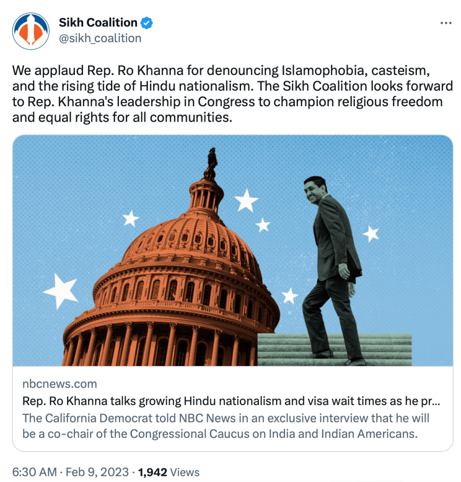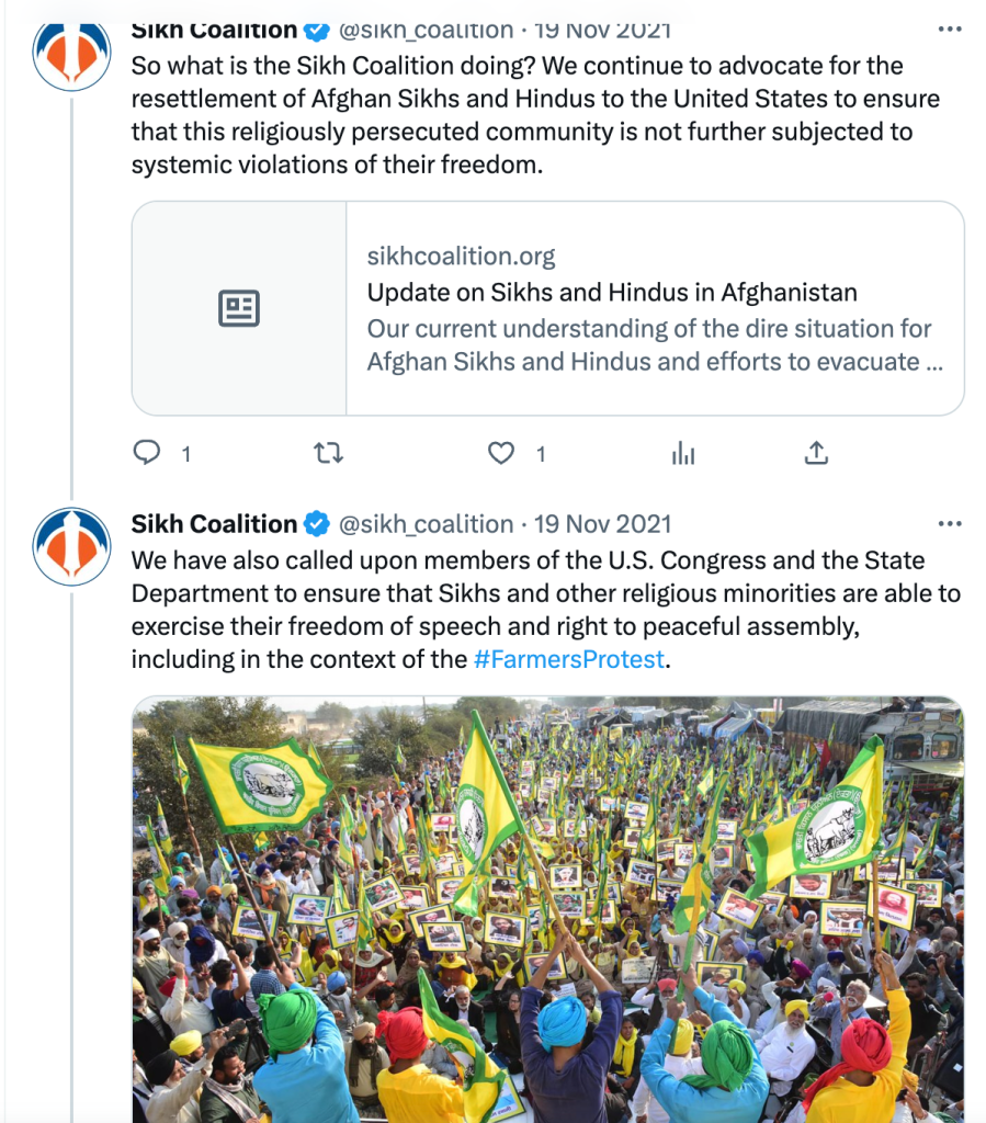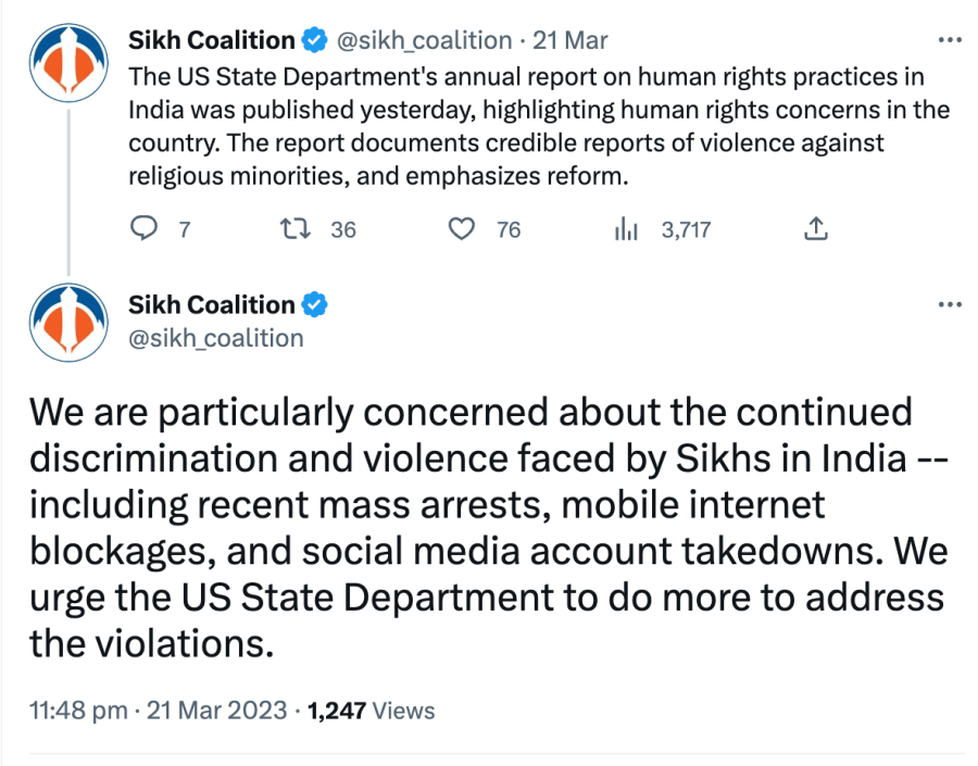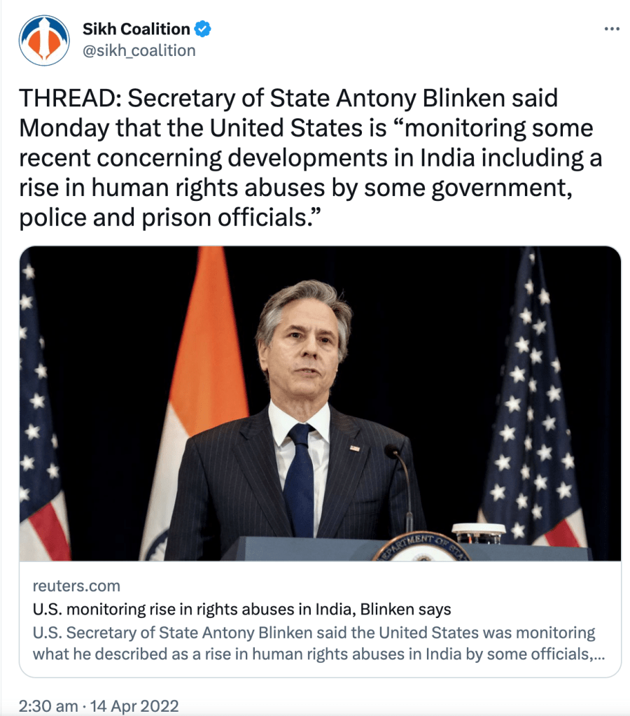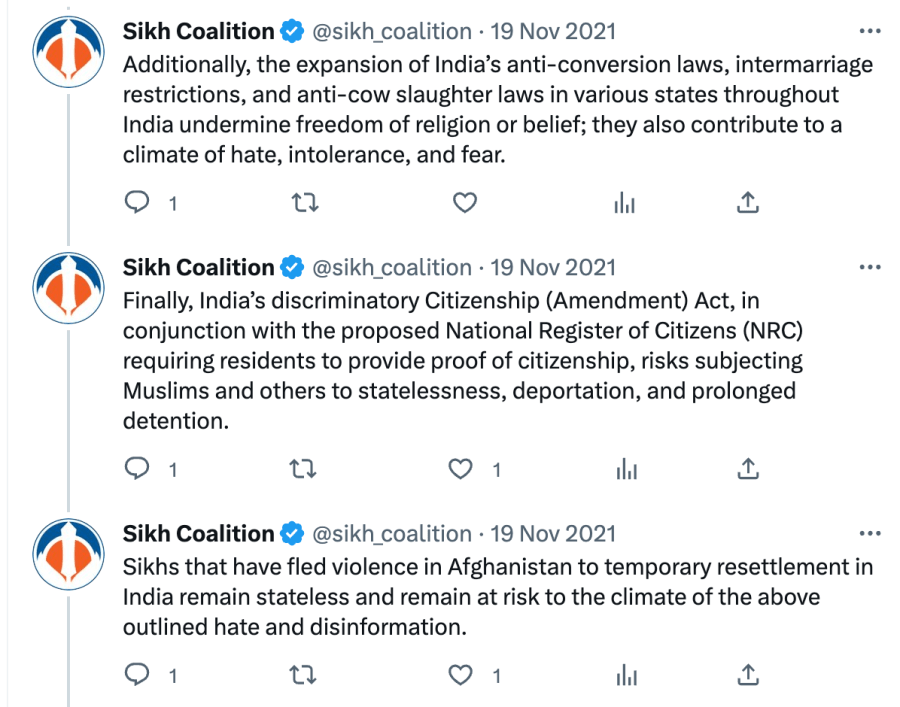 Since 2021, The Sikh Coalition has been recommending India be placed under ‘Countries of Particular Concern’ for being “engaged in or tolerated systematic, ongoing, and egregious violations of religious freedom.” They also claim Sikhs are being persecuted in India even though India has had a Sikh Prime Minister, President, Governors, Chief Ministers, Cabinet Ministers, Army Chiefs, doctors, engineers, lawyers, sports team captains, actors, singers, etc.