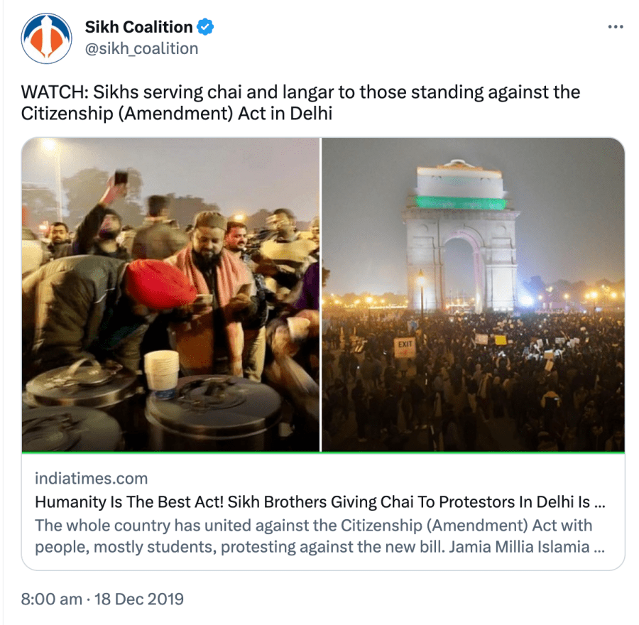 The Sikh Coalition also protested against India’s Farmers Bill and Citizenship Amendment Act (CAA).