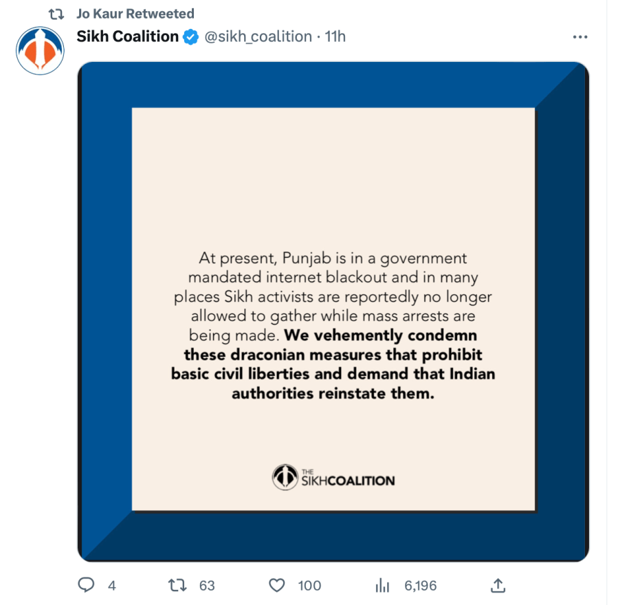The Sikh Coalition has opposed the abrogation of Articles 370 and 35A by the Indian government in Kashmir. In another Twitter post, they said, “Tensions in Kashmir continue to escalate w/ ongoing reports of media blackouts, lockdowns, & troops patrolling the streets. There are serious concerns about these conditions mirroring those imposed by the Indian govt in the aftermath of 1984 anti-Sikh pogroms.”