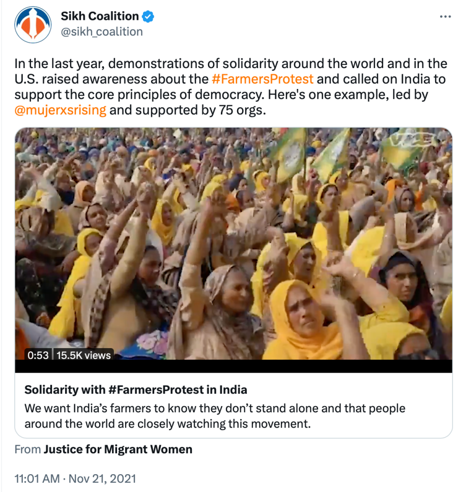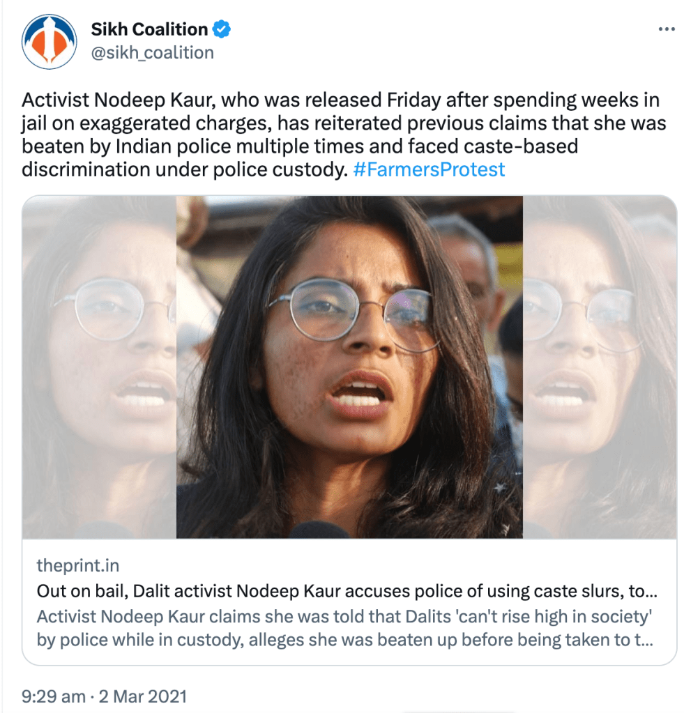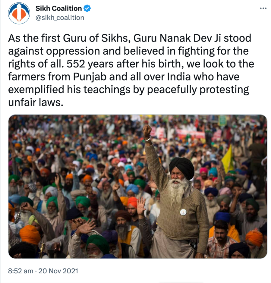Further in the above post, The Sikh Coalition repeat that 3 farm laws are discriminatory and should be repealed but again, no mention of what specifically in the bills they find discriminatory or unfair. They further say that the Indian government is repressing the farmers and are facing violence from the government