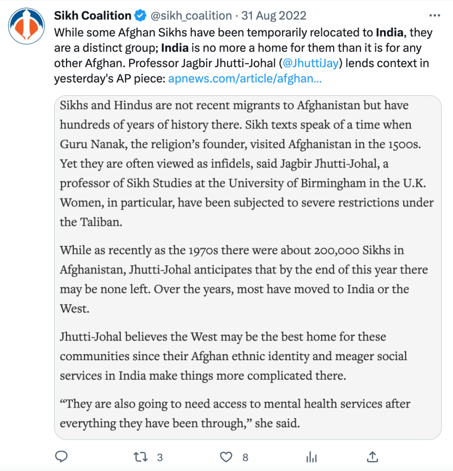While India has been evacuating and resettling persecuted Sikhs from Afghanistan, The Sikh Coalition rumoured that Sikhs fleeing violence in Afghanistan are “facing the same” at an increased risk” of the same violence in India.