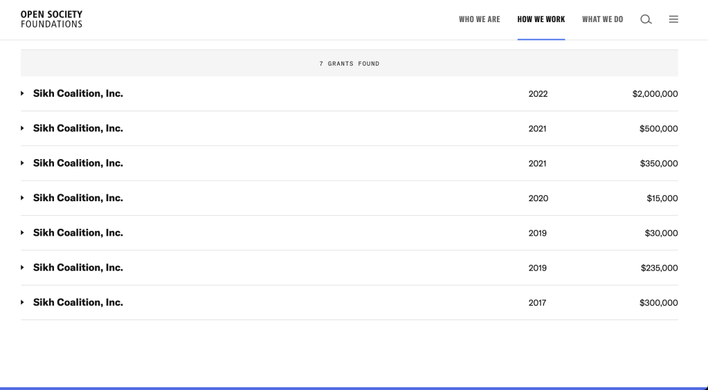 The Sikh Coalition regularly gets funds from George Soros’s Open Society Foundations. George Soros famously said that he had set aside a fund of USD 1 billion to tackle the spread of nationalism.