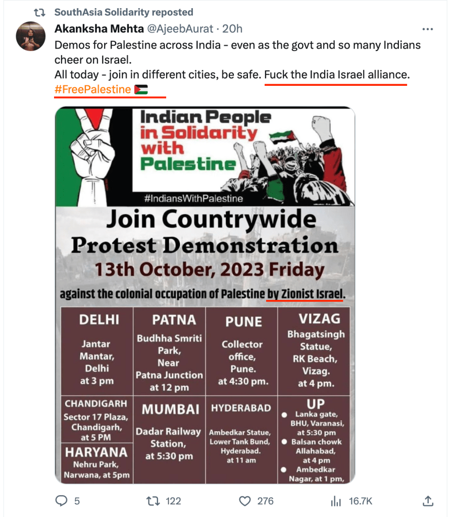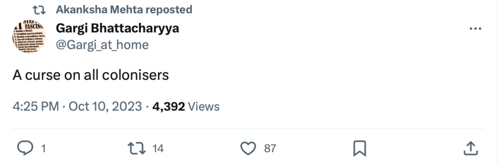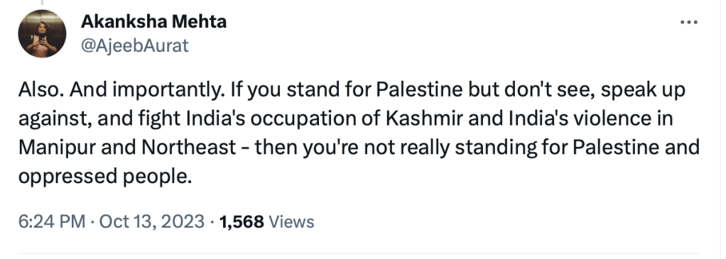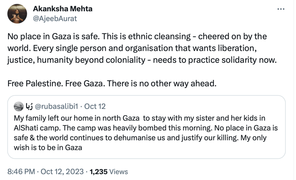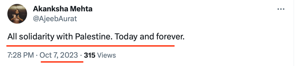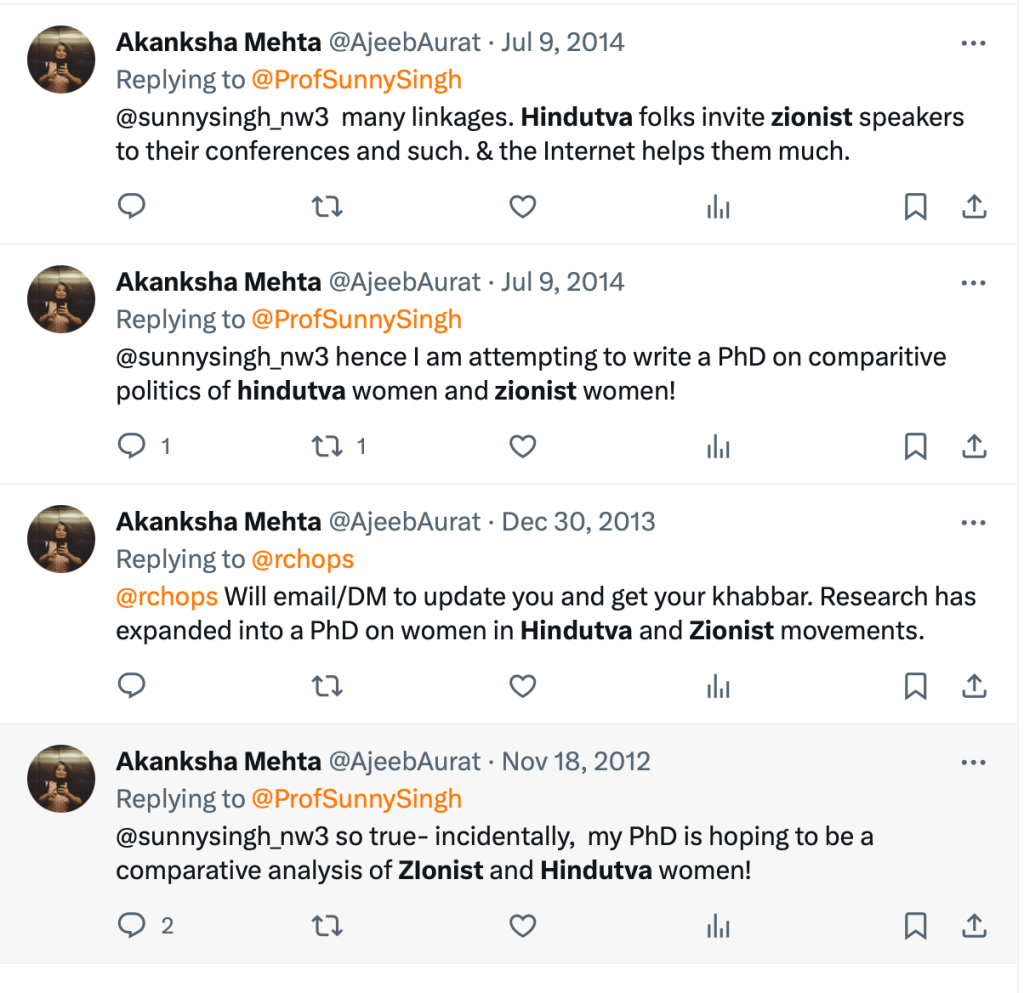In 2023, Akanksha Mehta signed a petition “Scholars of South Asia in Solidarity with Palestine” in support of Hamas terrorists attack on innocent Jewish men, women and children.The petition draws direct comparison between Hindutva and Zionism and calls India a ‘settler-colonial’ in Kashmir. She also posted on her X account, “Solidarity with Palestine. Today and forever” on the 7th of October, the day when Hamas terrorised, shot elderly citizens, raped women and burned alive families alive including children.