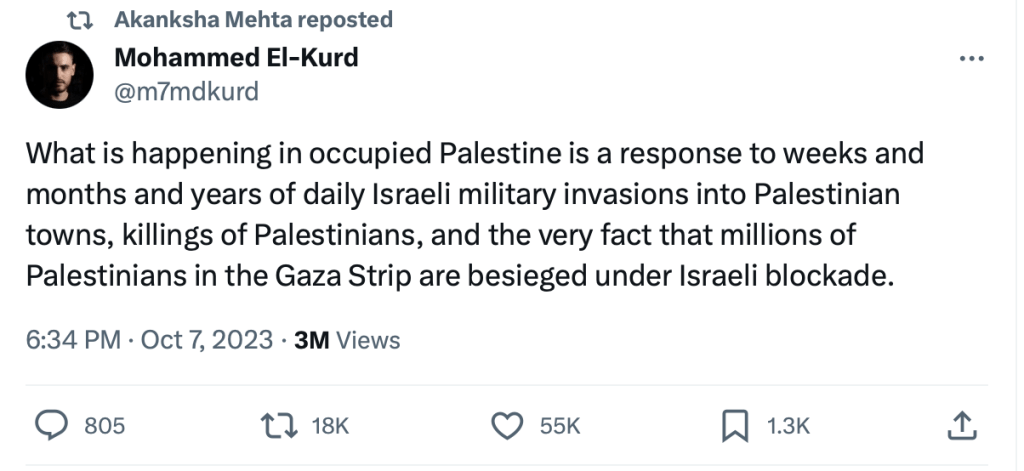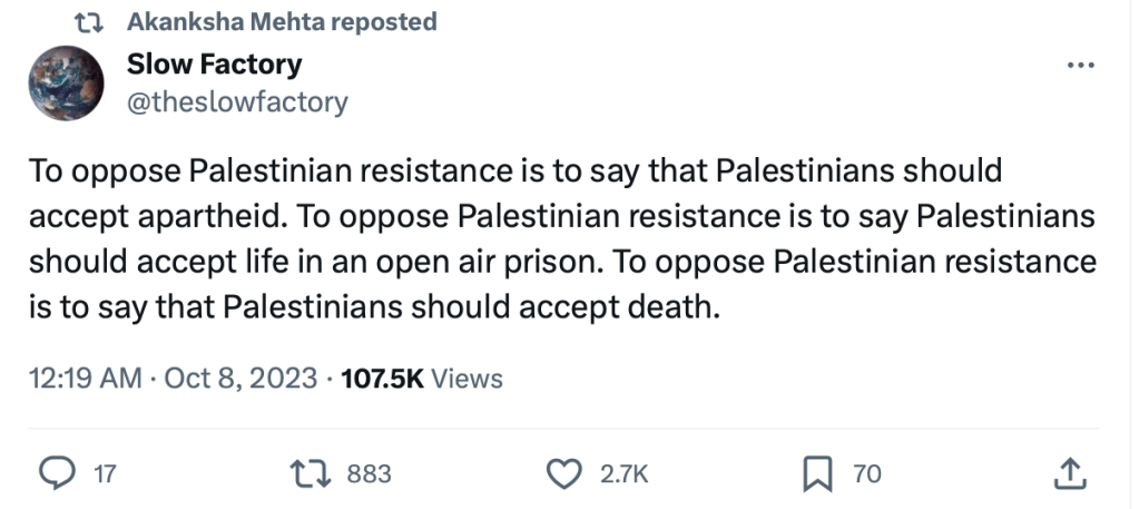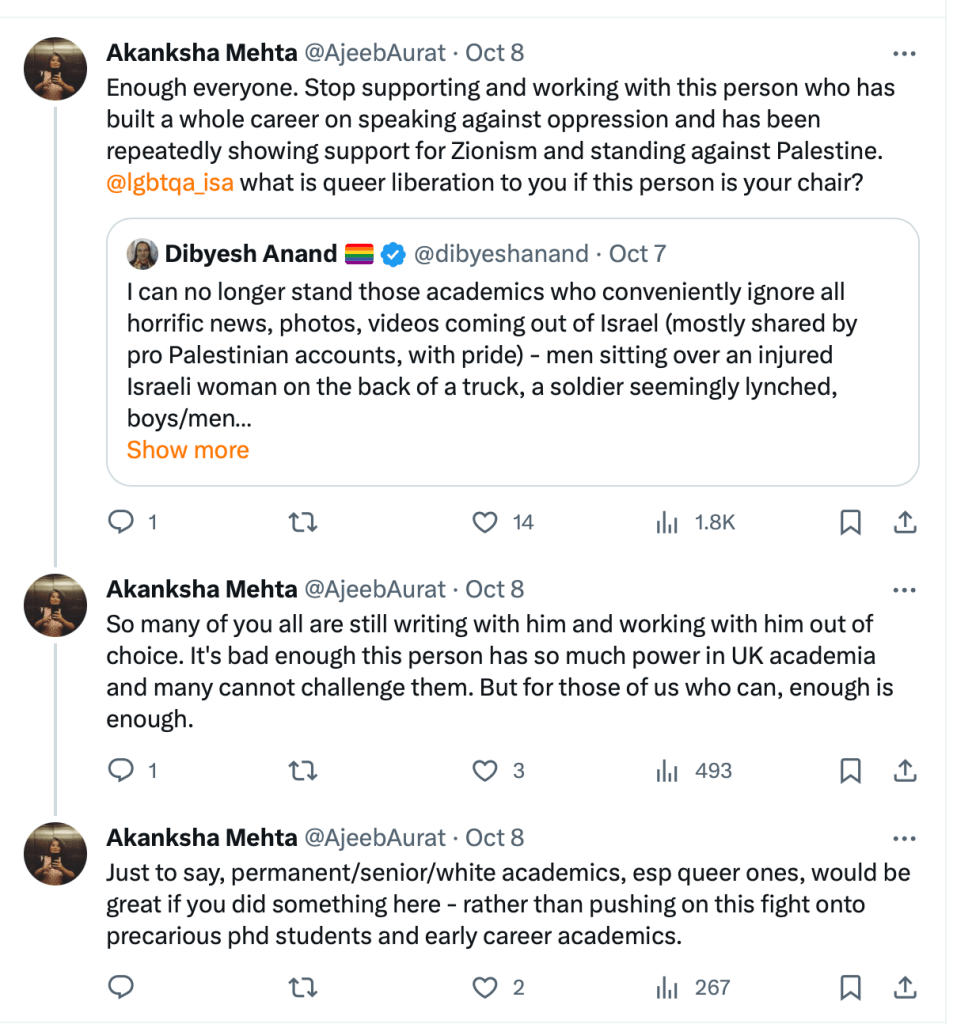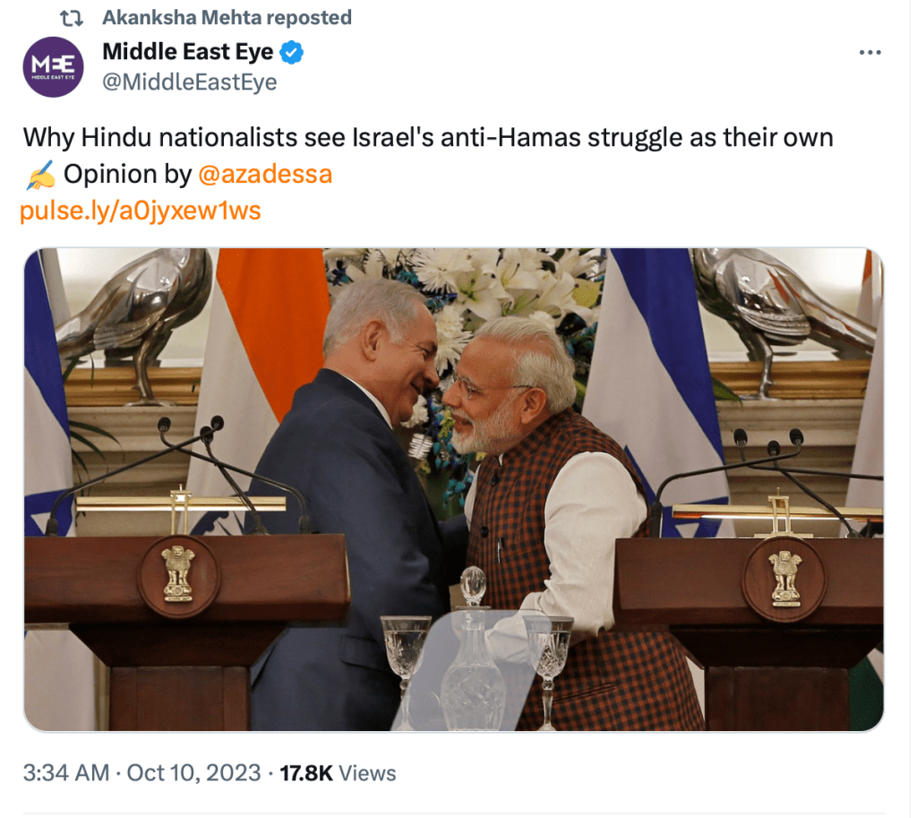 In 2023, Akanksha Mehta signed a petition “Scholars of South Asia in Solidarity with Palestine” in support of Hamas terrorists attack on innocent Jewish men, women and children.The petition draws direct comparison between Hindutva and Zionism and calls India a ‘settler-colonial’ in Kashmir. She also posted on her X account, “Solidarity with Palestine. Today and forever” on the 7th of October, the day when Hamas terrorised, shot elderly citizens, raped women and burned alive families alive including children.