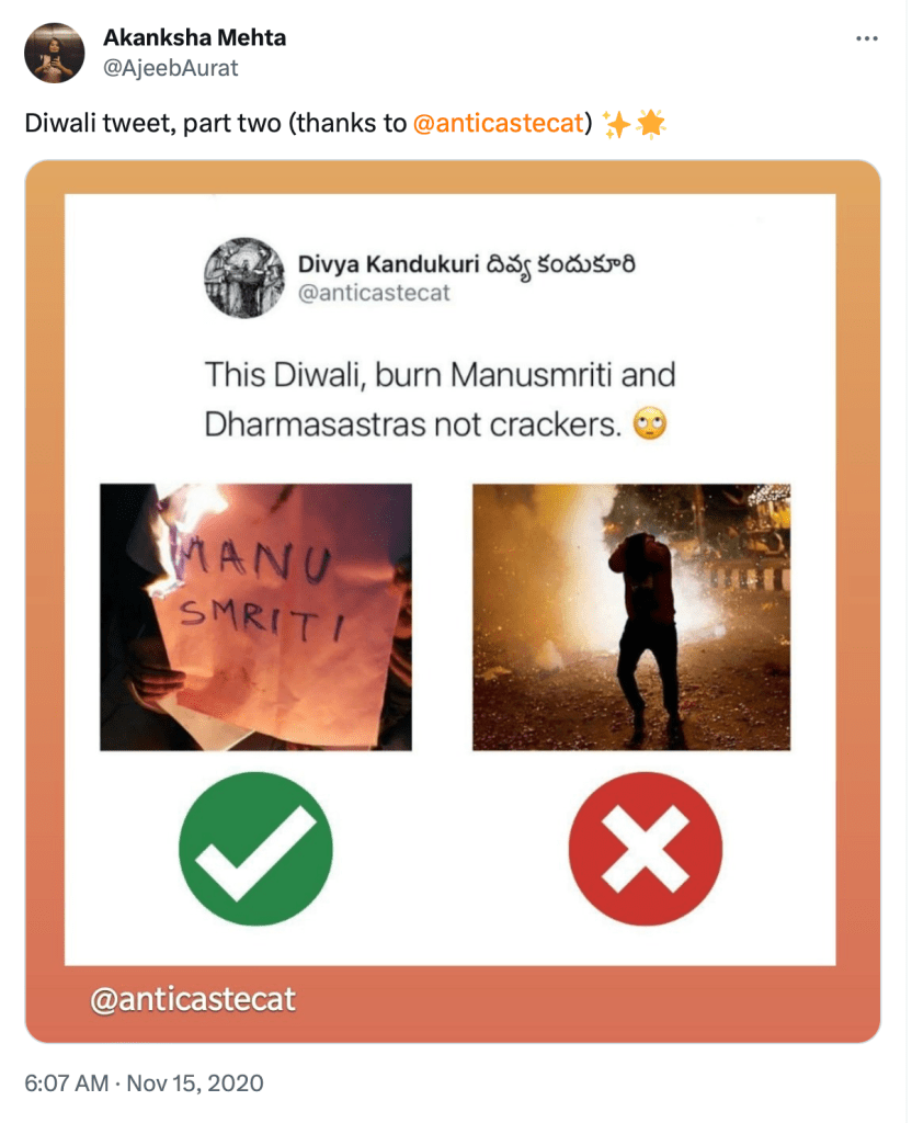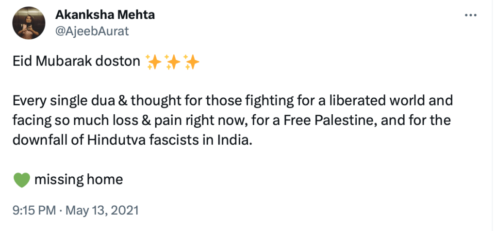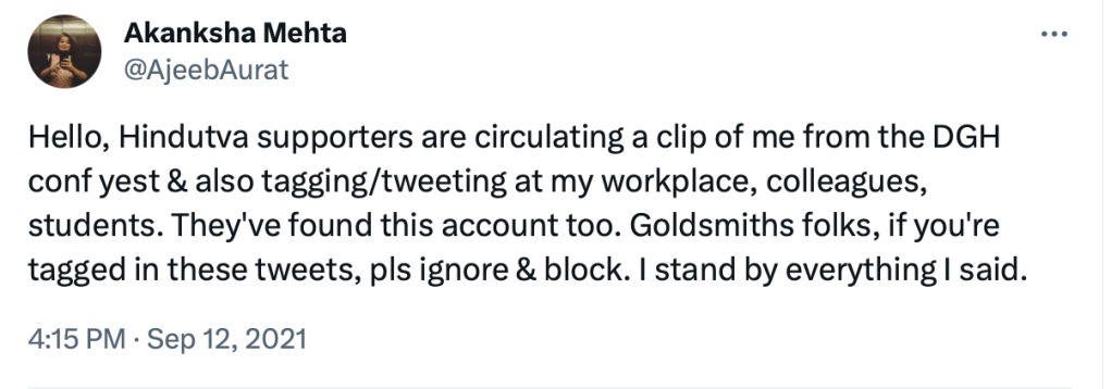 In 2021, Akanksha Mehta was one of the invitees who spoke at the Dismantling Global Hindutva Conference. Here she said “Hindutva is inseparable from Hinduism and arguments that Hindutva is not Hinduism is dangerous and brahminical and laced with erasure and violence. It will not lead us to the future we want…..”